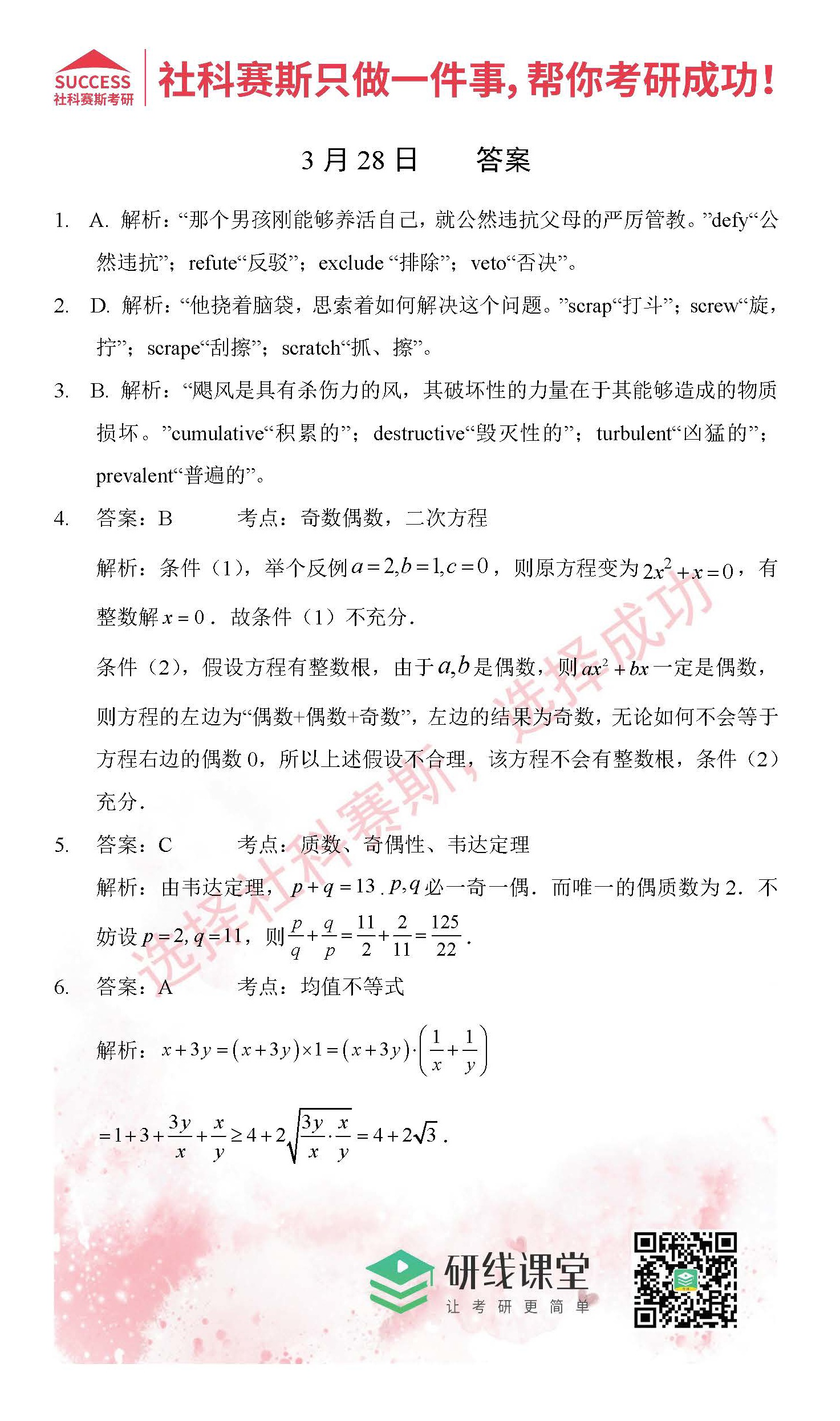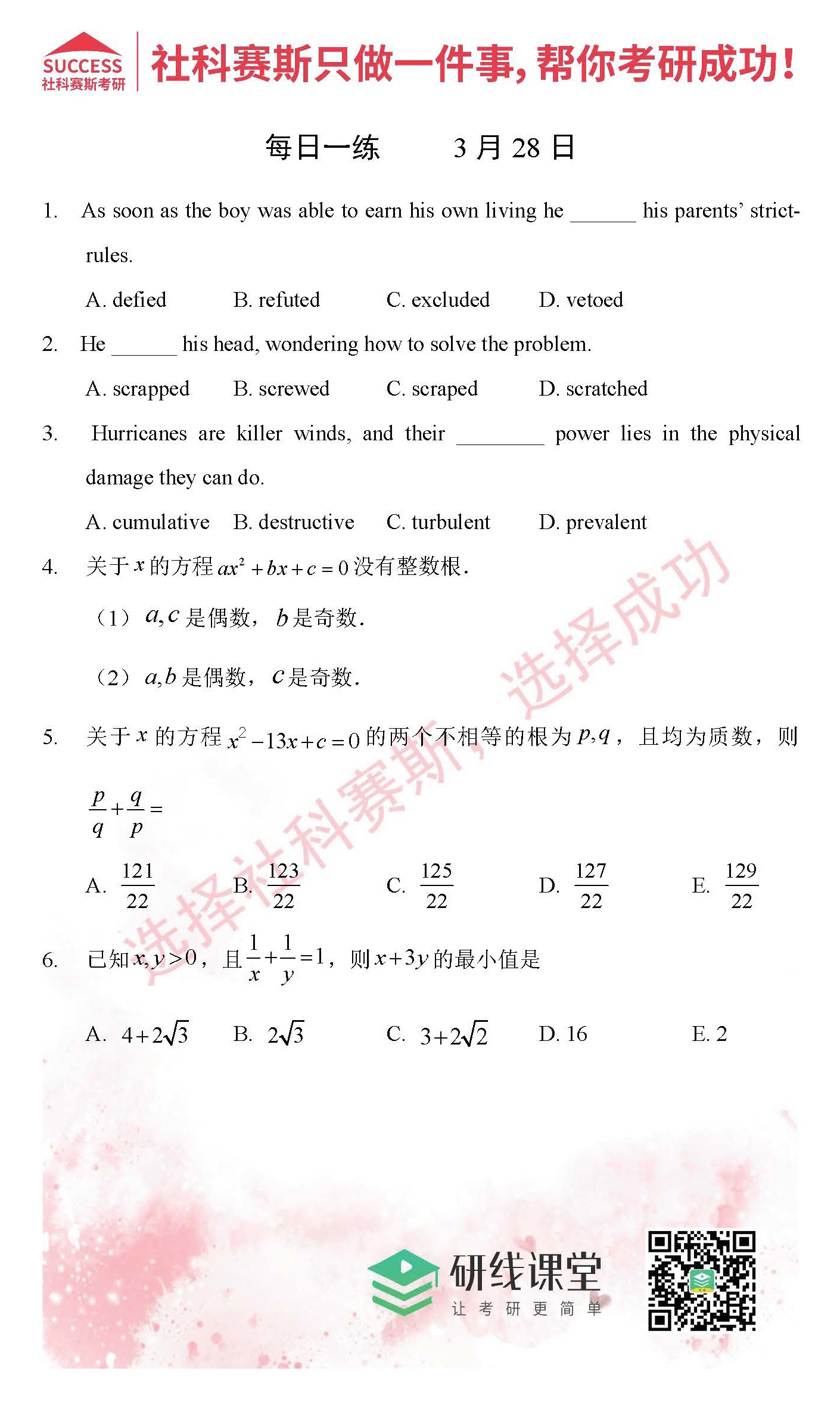 導(dǎo)讀:考研是一場(chǎng)持久戰(zhàn),保持良好的學(xué)習(xí)習(xí)慣,是能確保復(fù)習(xí)高效的關(guān)鍵。MBA備考網(wǎng)小編整理了管綜的每日一練,希望能對(duì)廣大考生有所幫助。