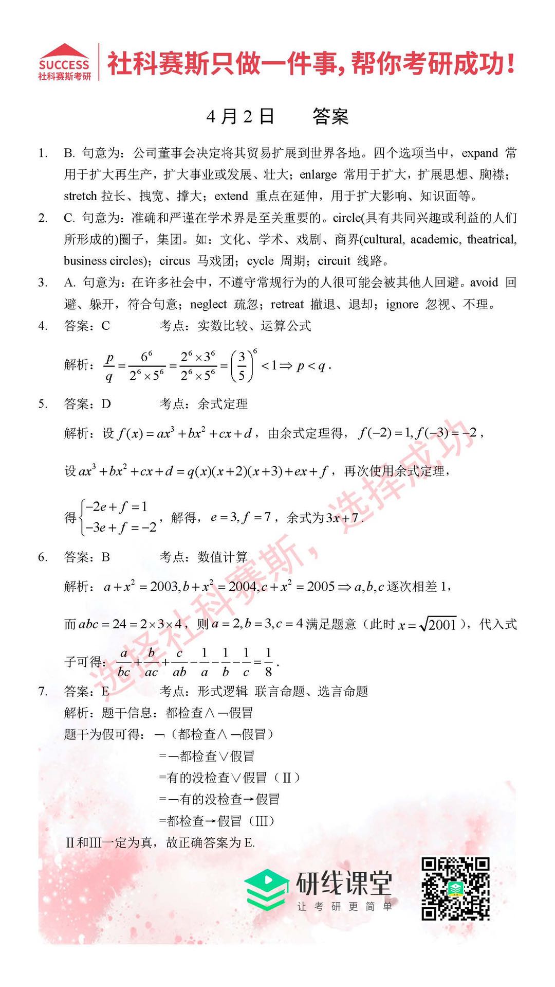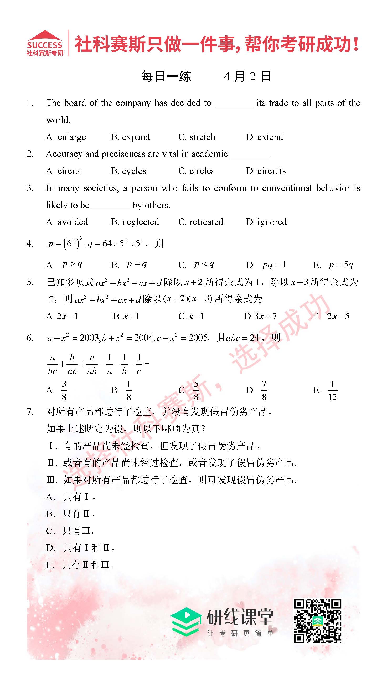 導讀:考研是一場持久戰,保持良好的學習習慣,是能確保復習高效的關鍵。MBA備考網小編整理了每日一練,希望能對廣大考生有所幫助。