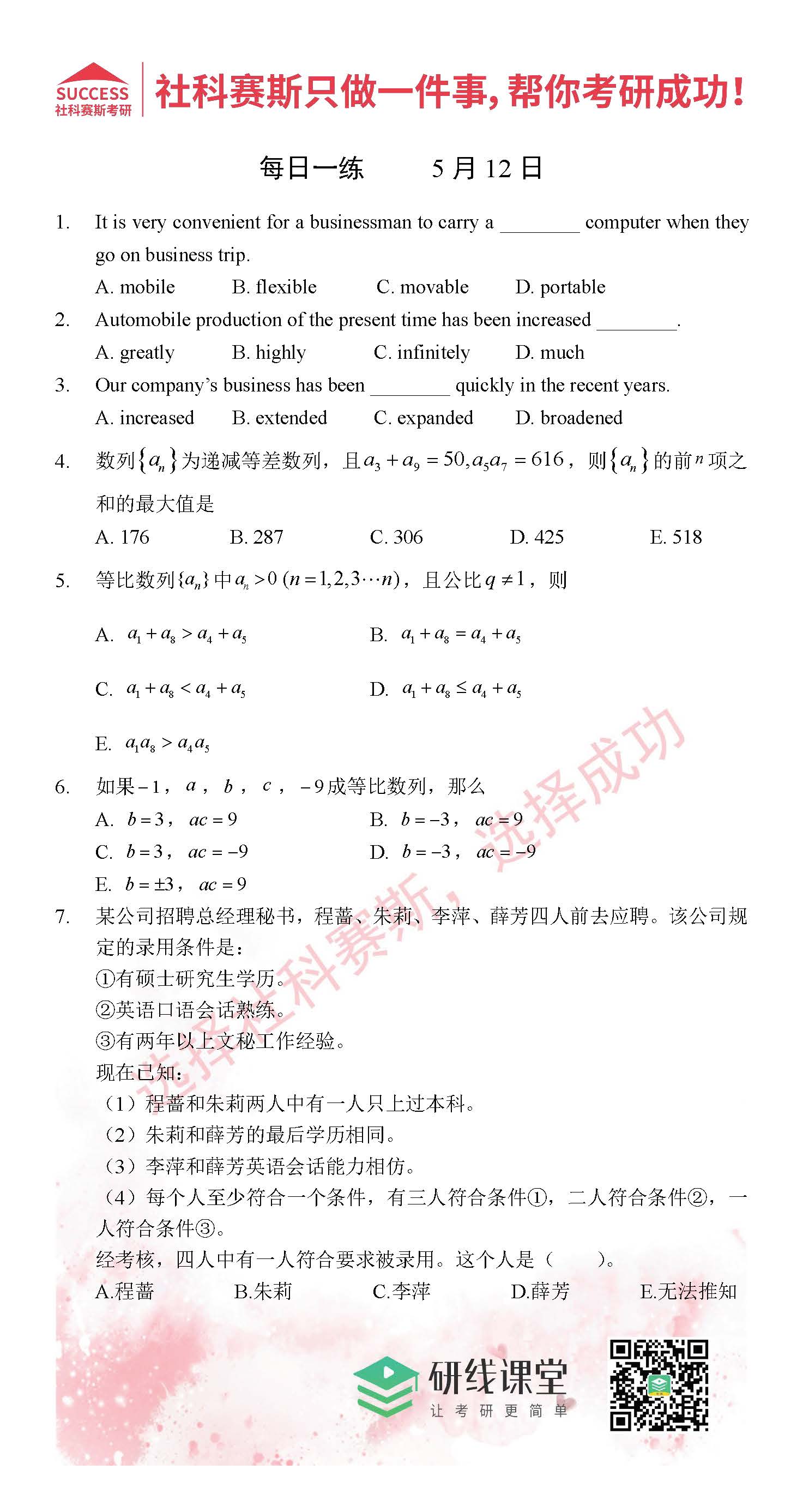 導讀:考研是一場持久戰,保持良好的學習習慣,是能確保復習高效的關鍵。MBA備考網小編整理了管綜的每日一練,希望能對廣大考生有所幫助。