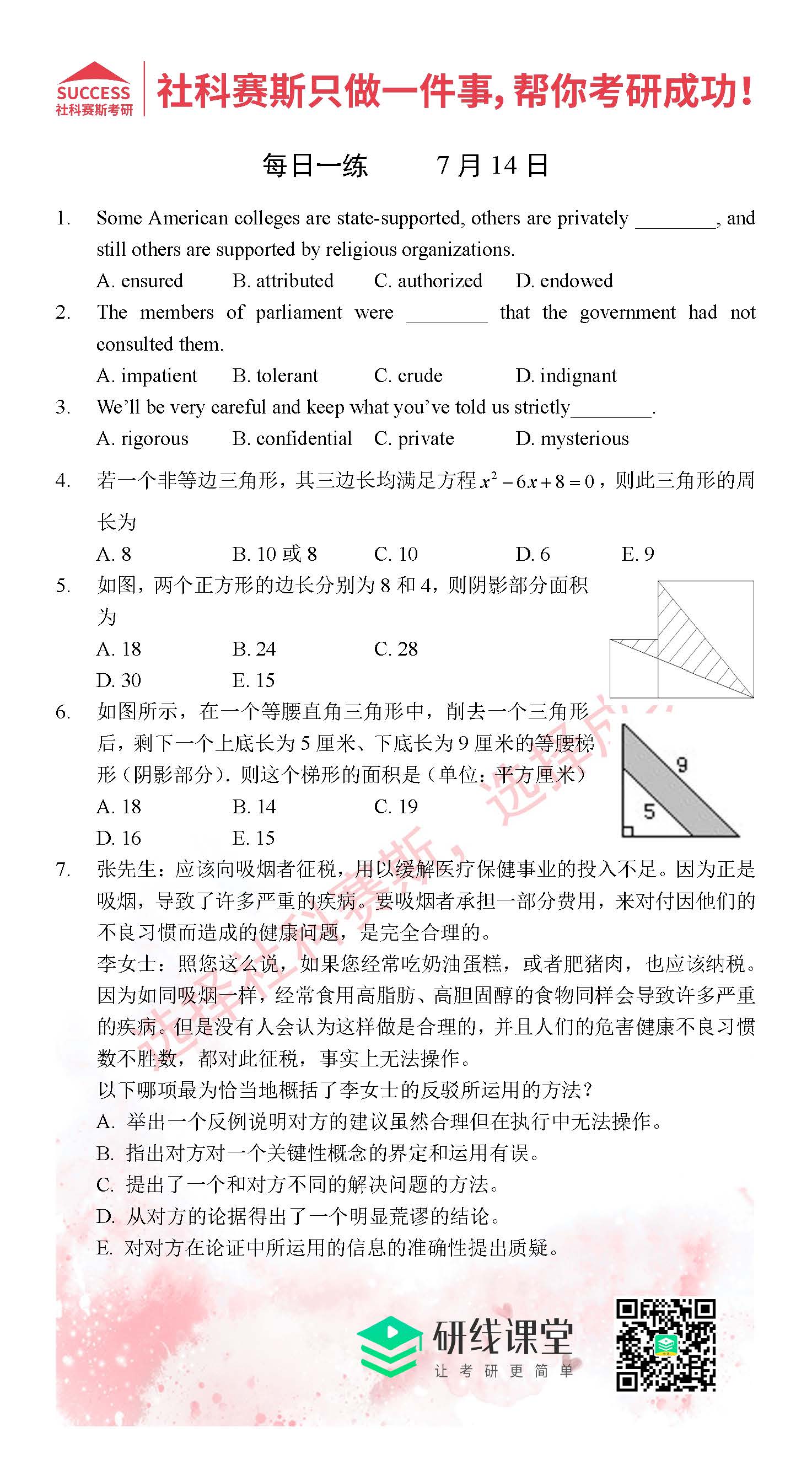 以上就是MBA備考網小編為大家提供的今日的每日一練“2021管理類聯考7月14日每日一練及答案”的全部內容,希望各位考生堅持利用起來,更多每日一練內容請持續關注MBA備考網管理類聯考每日一練