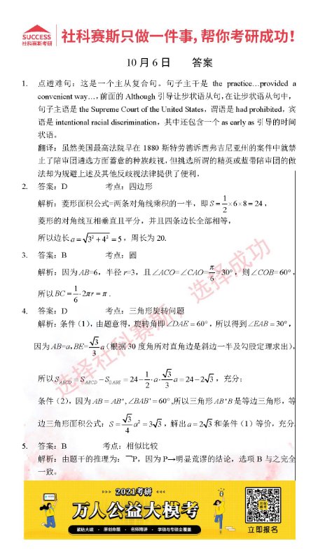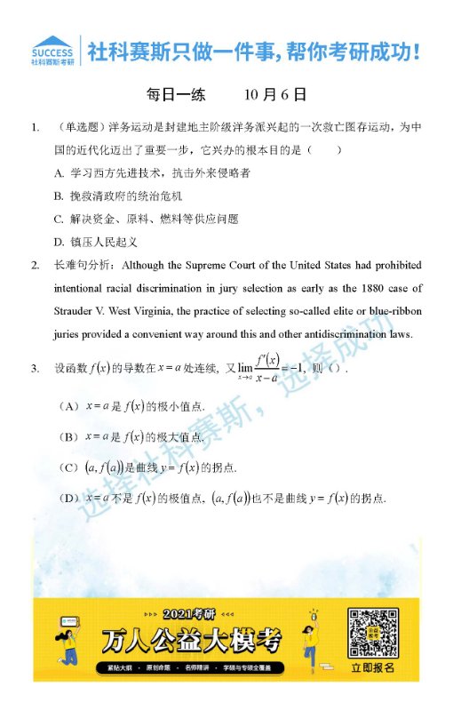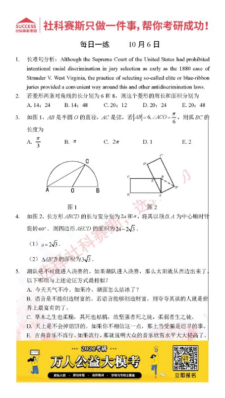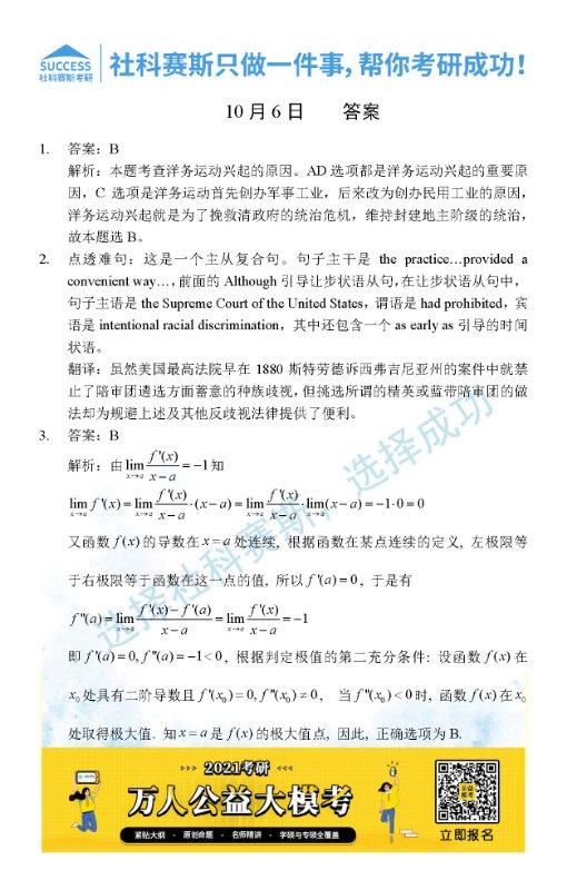 考研是一場持久戰(zhàn),保持良好的學(xué)習(xí)習(xí)慣,是能確保復(fù)習(xí)高效的關(guān)鍵。今天社科賽斯MBA備考網(wǎng)小編整理了“2021管理類聯(lián)考10月6日每日一練及答案”的內(nèi)容,希望能對廣大考生有所幫助。