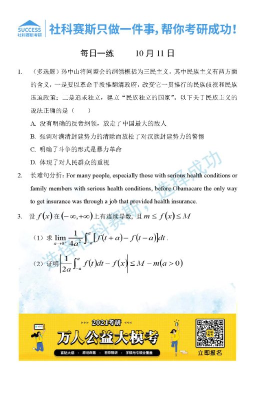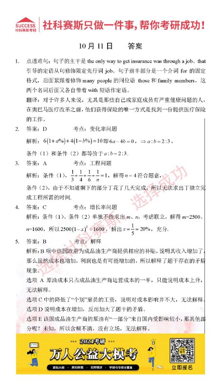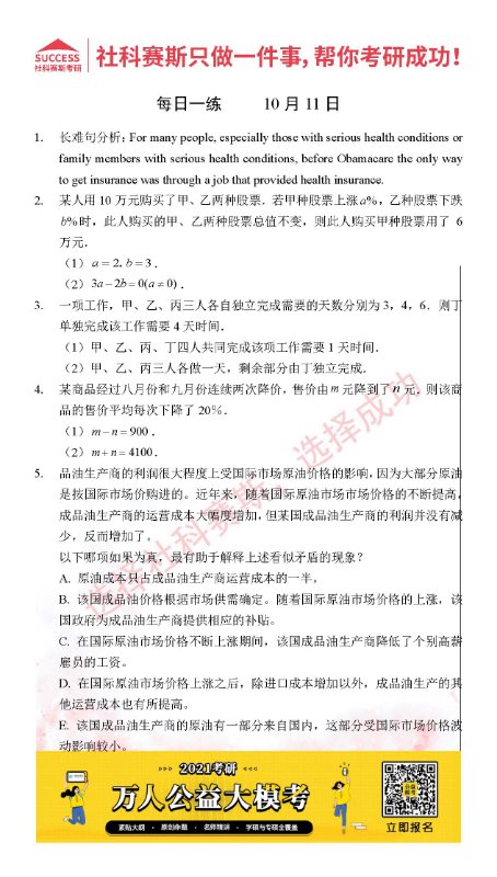 考研是一場持久戰,保持良好的學習習慣,是能確保復習高效的關鍵。今天社科賽斯MBA備考網小編整理了“2021管理類聯考10月11日每日一練及答案”的內容,希望能對廣大考生有所幫助。