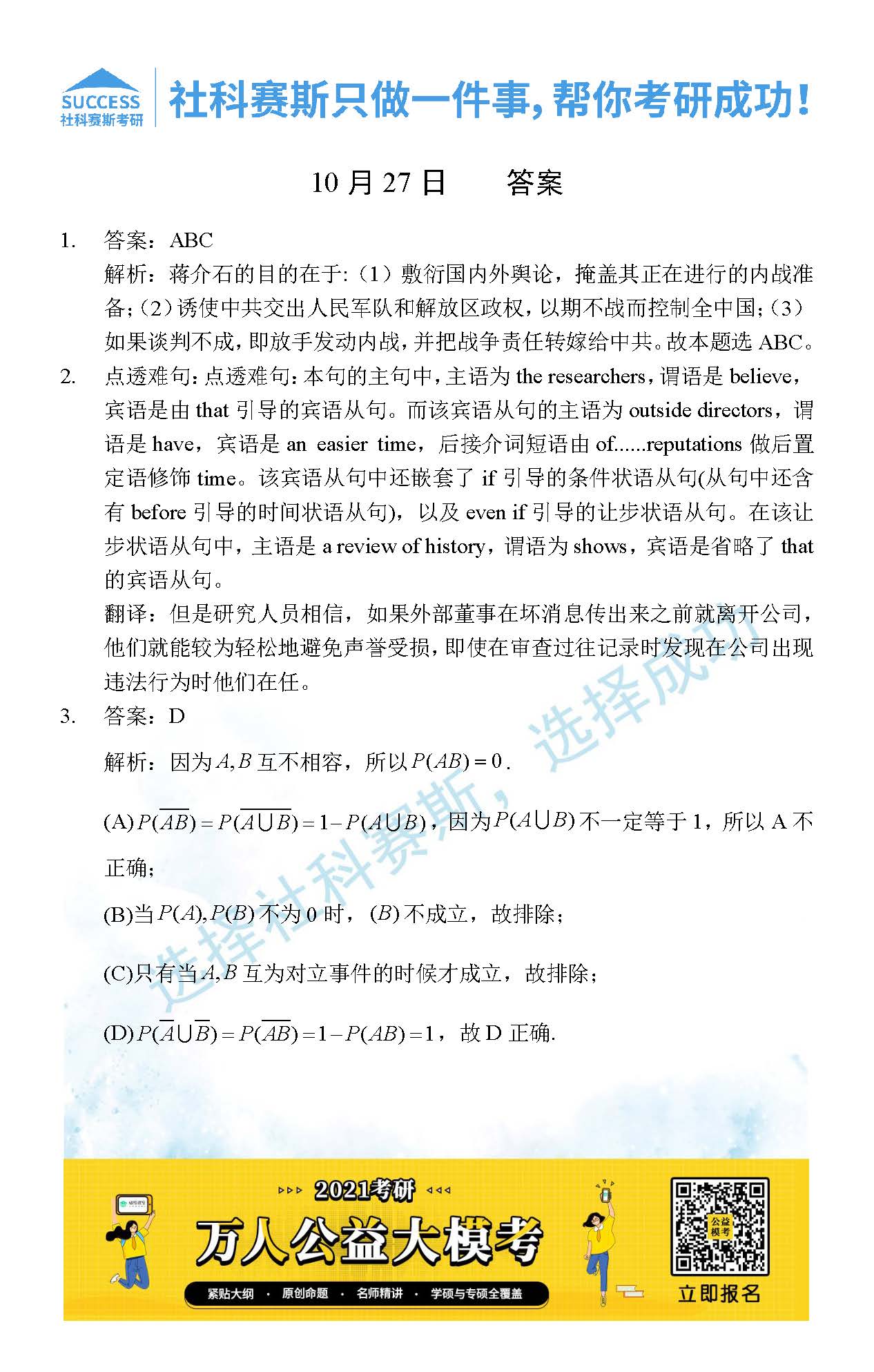 考研是一場持久戰,保持良好的學習習慣,是能確保復習高效的關鍵。今天社科賽斯MBA備考網小編整理了“2021管理類聯10月27日每日一練及答案”的內容,希望能對廣大考生有所幫助。