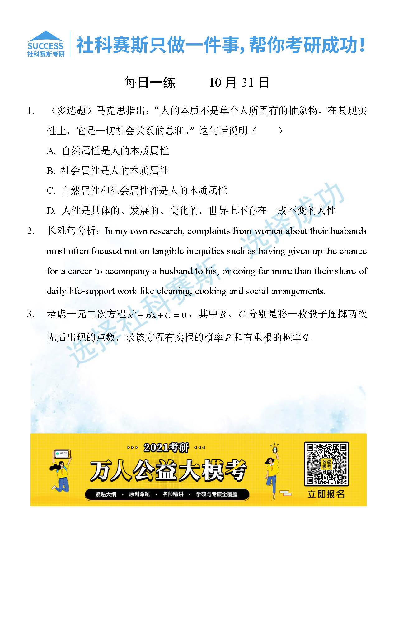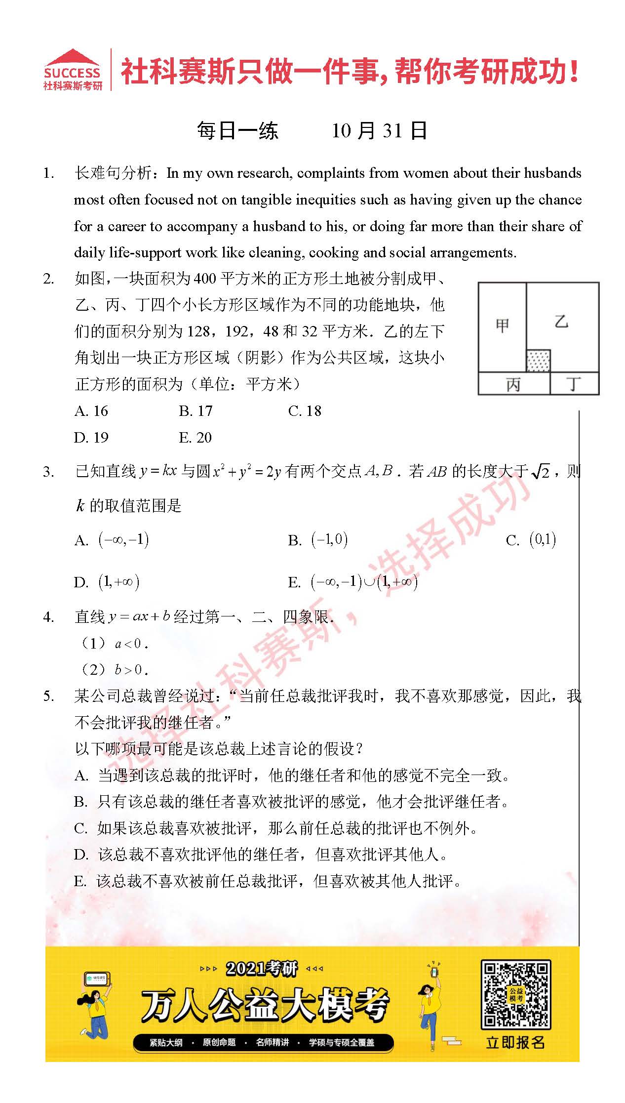考研是一場持久戰,保持良好的學習習慣,是能確保復習高效的關鍵。今天社科賽斯MBA備考網小編整理了“2021管理類聯10月30日每日一練及答案”的內容,希望能對廣大考生有所幫助。