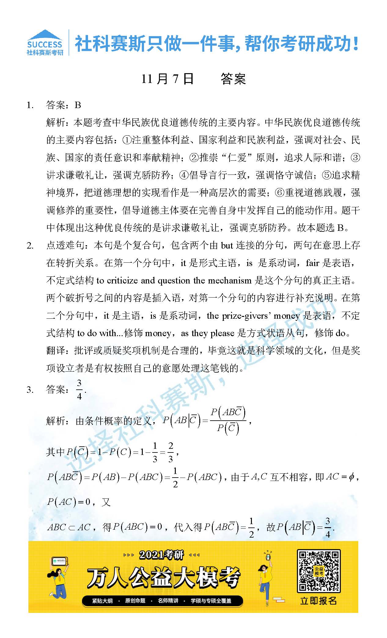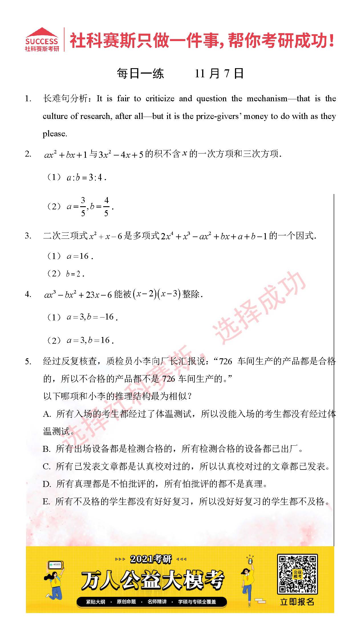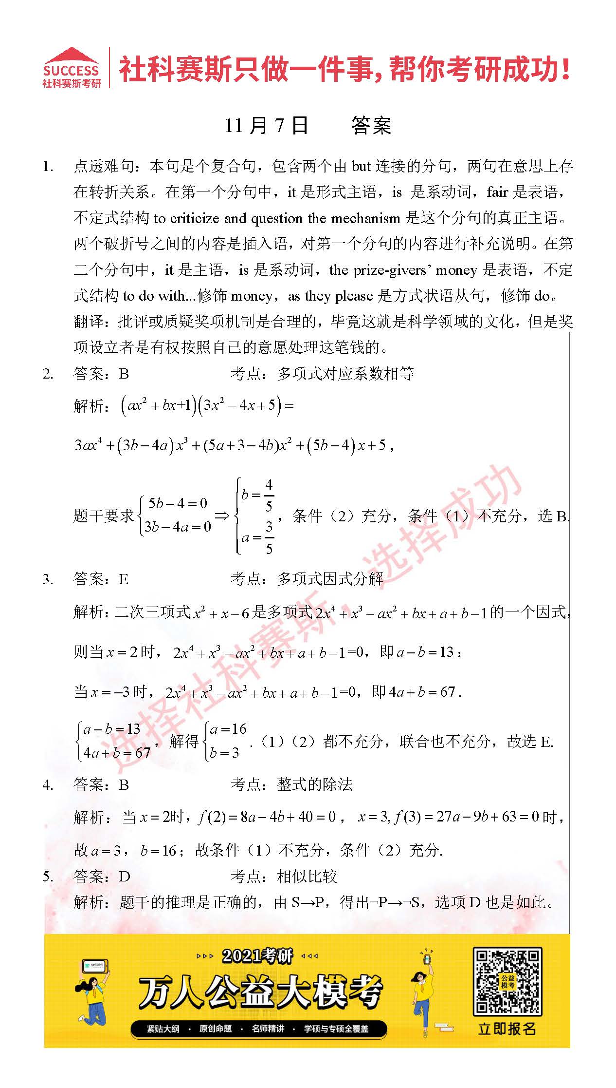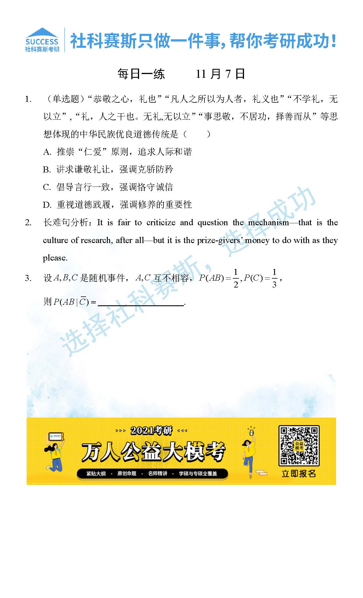 考研是一場持久戰,保持良好的學習習慣,是能確保復習高效的關鍵。今天社科賽斯MBA備考網小編整理了“2021管理類聯11月7日每日一練及答案”的內容,希望能對廣大考生有所幫助。