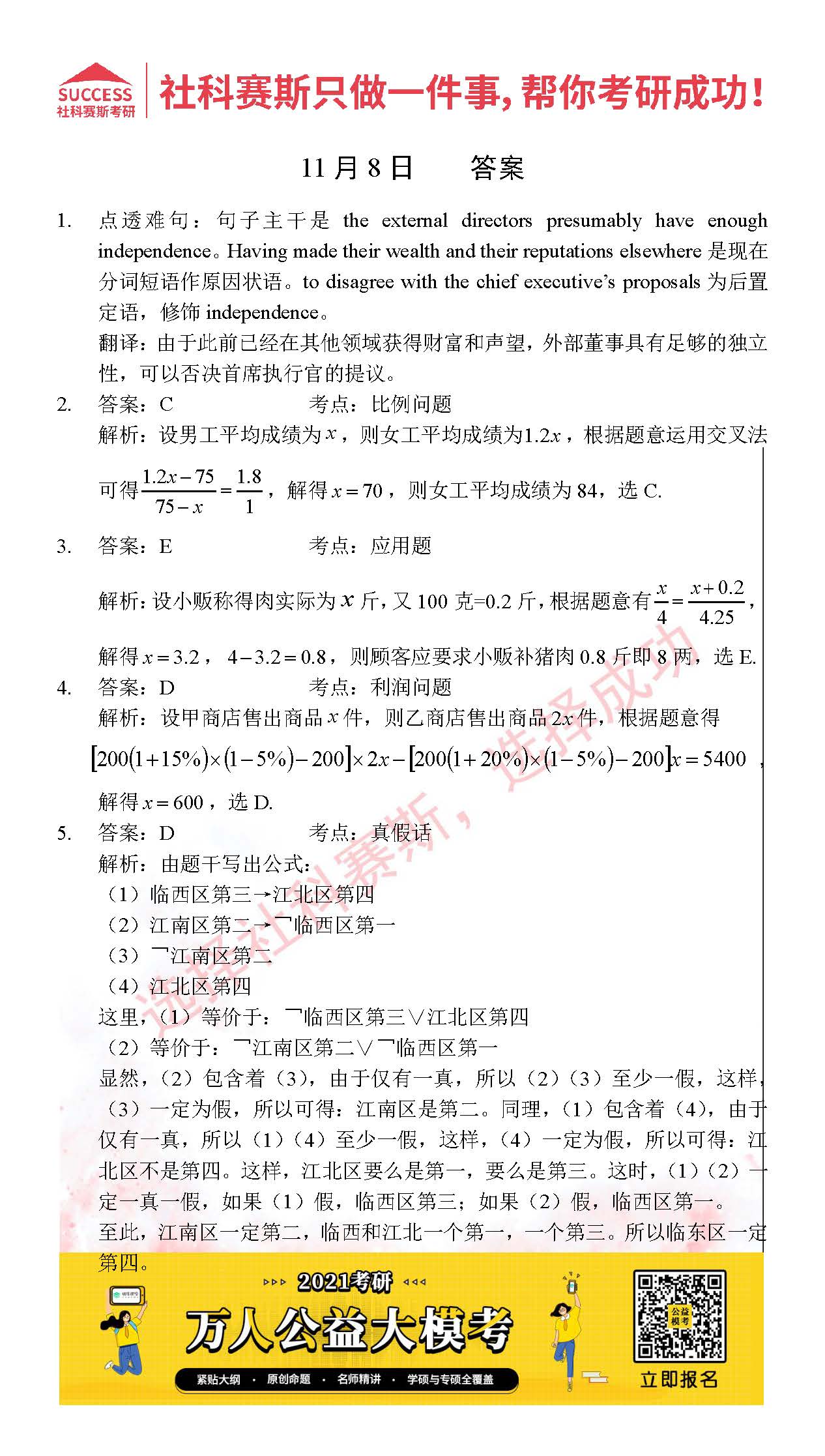 考研是一場持久戰(zhàn),保持良好的學(xué)習(xí)習(xí)慣,是能確保復(fù)習(xí)高效的關(guān)鍵。今天社科賽斯MBA備考網(wǎng)小編整理了“2021管理類聯(lián)11月8日每日一練及答案”的內(nèi)容,希望能對廣大考生有所幫助。