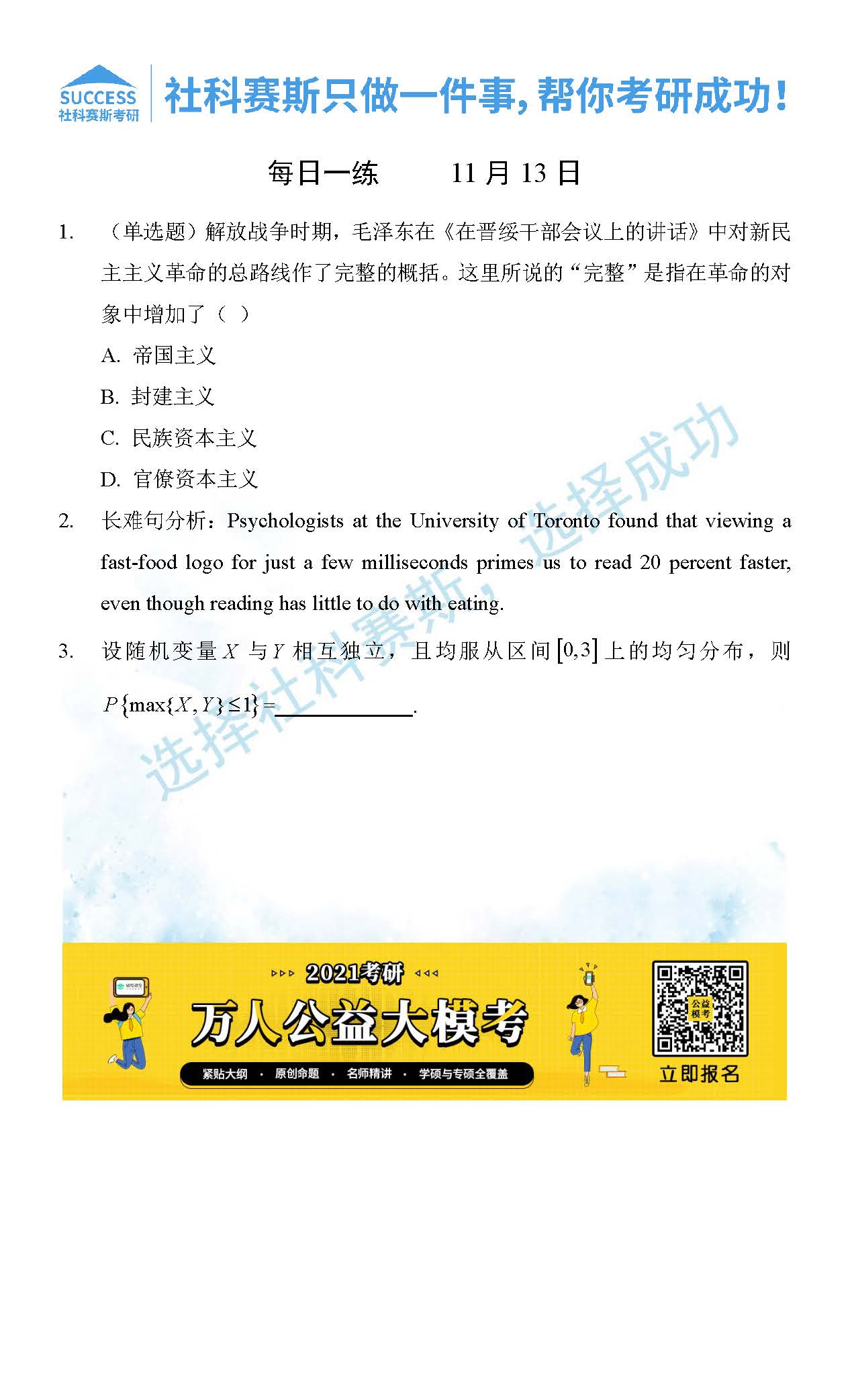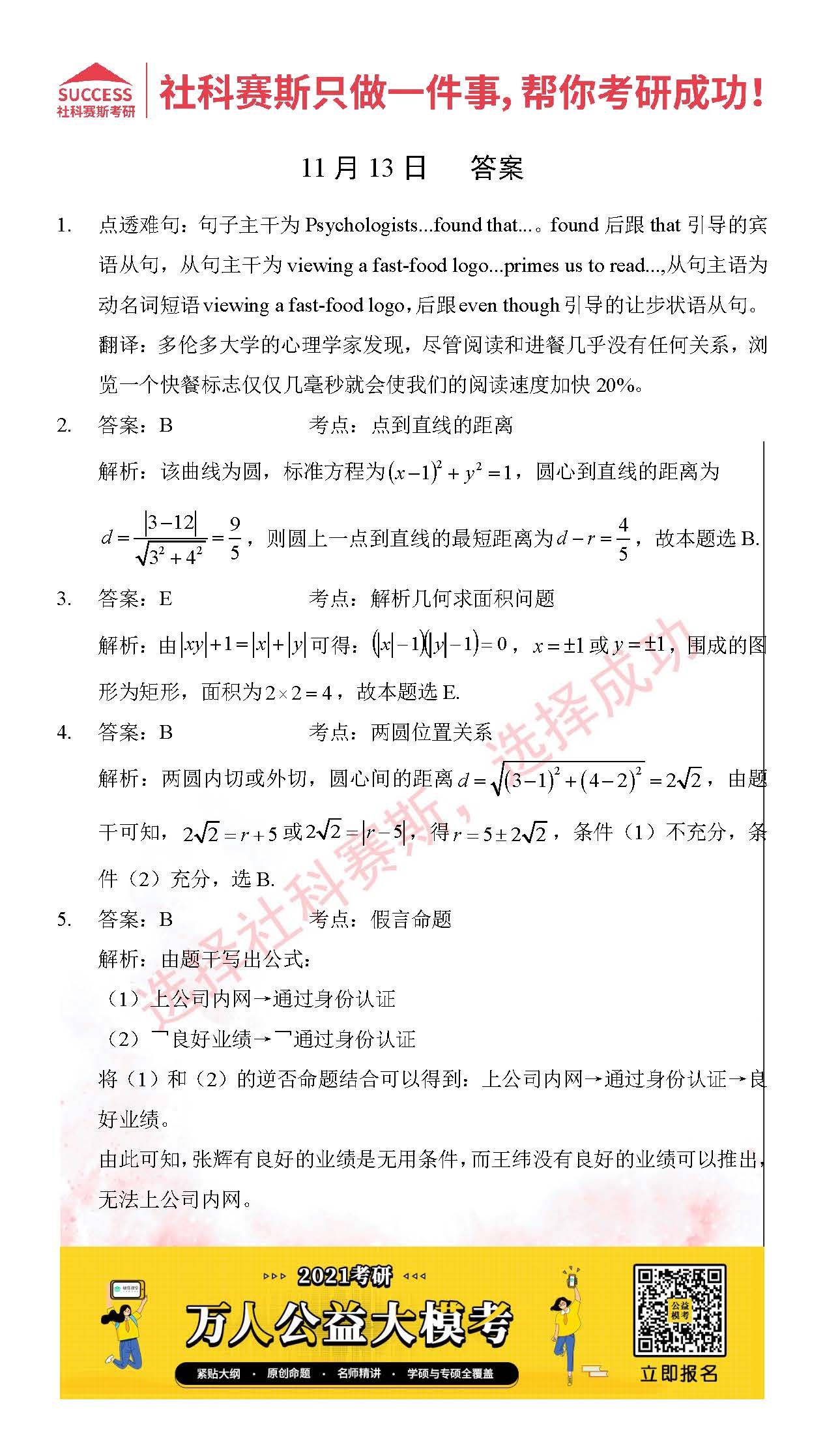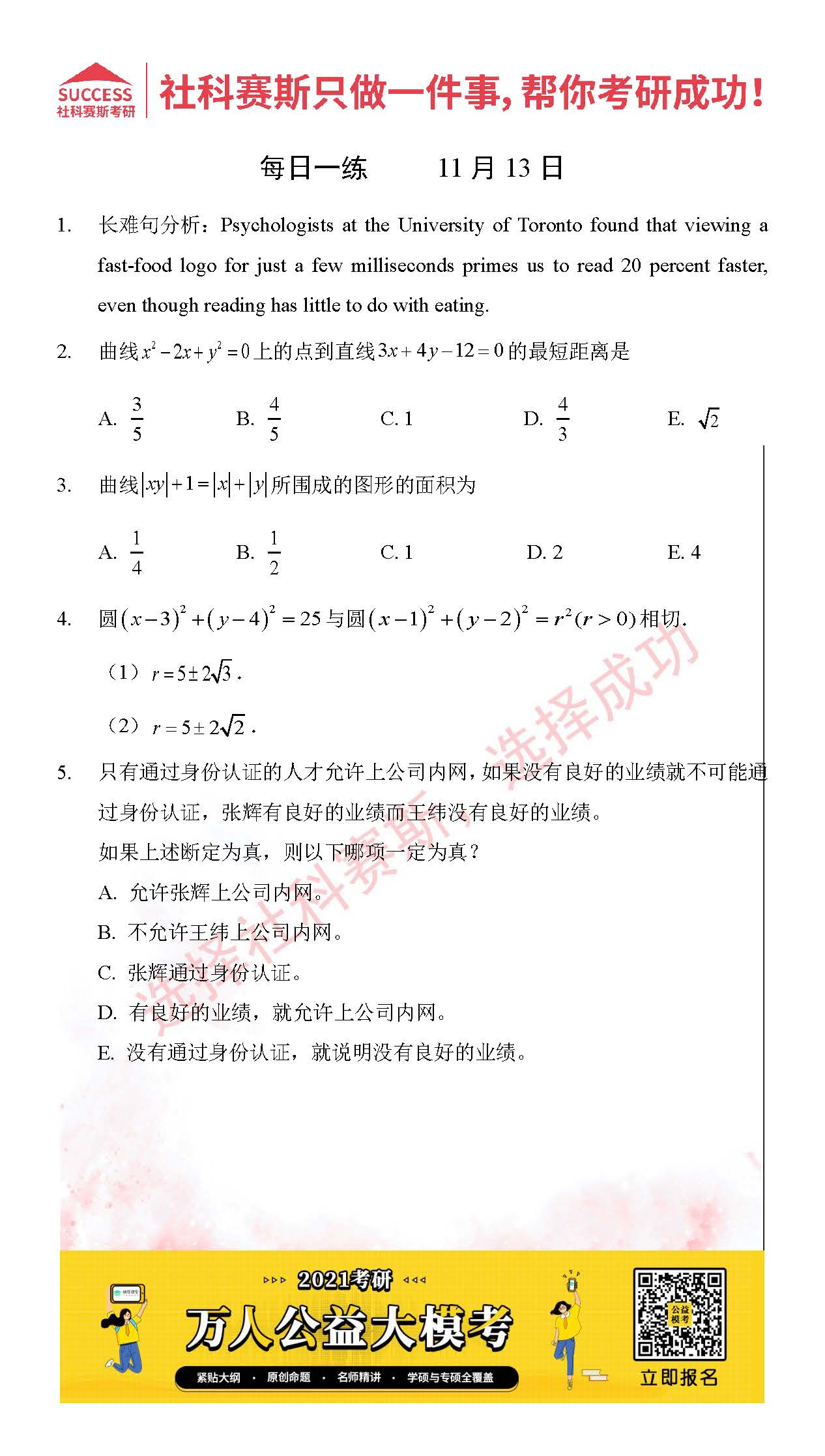 考研是一場持久戰(zhàn),保持良好的學(xué)習(xí)習(xí)慣,是能確保復(fù)習(xí)高效的關(guān)鍵。今天社科賽斯MBA備考網(wǎng)小編整理了“2021管理類聯(lián)11月13日每日一練及答案”的內(nèi)容,希望能對廣大考生有所幫助。
