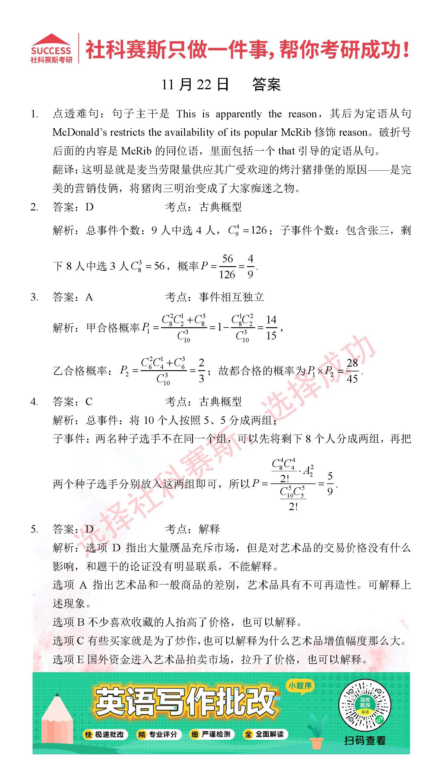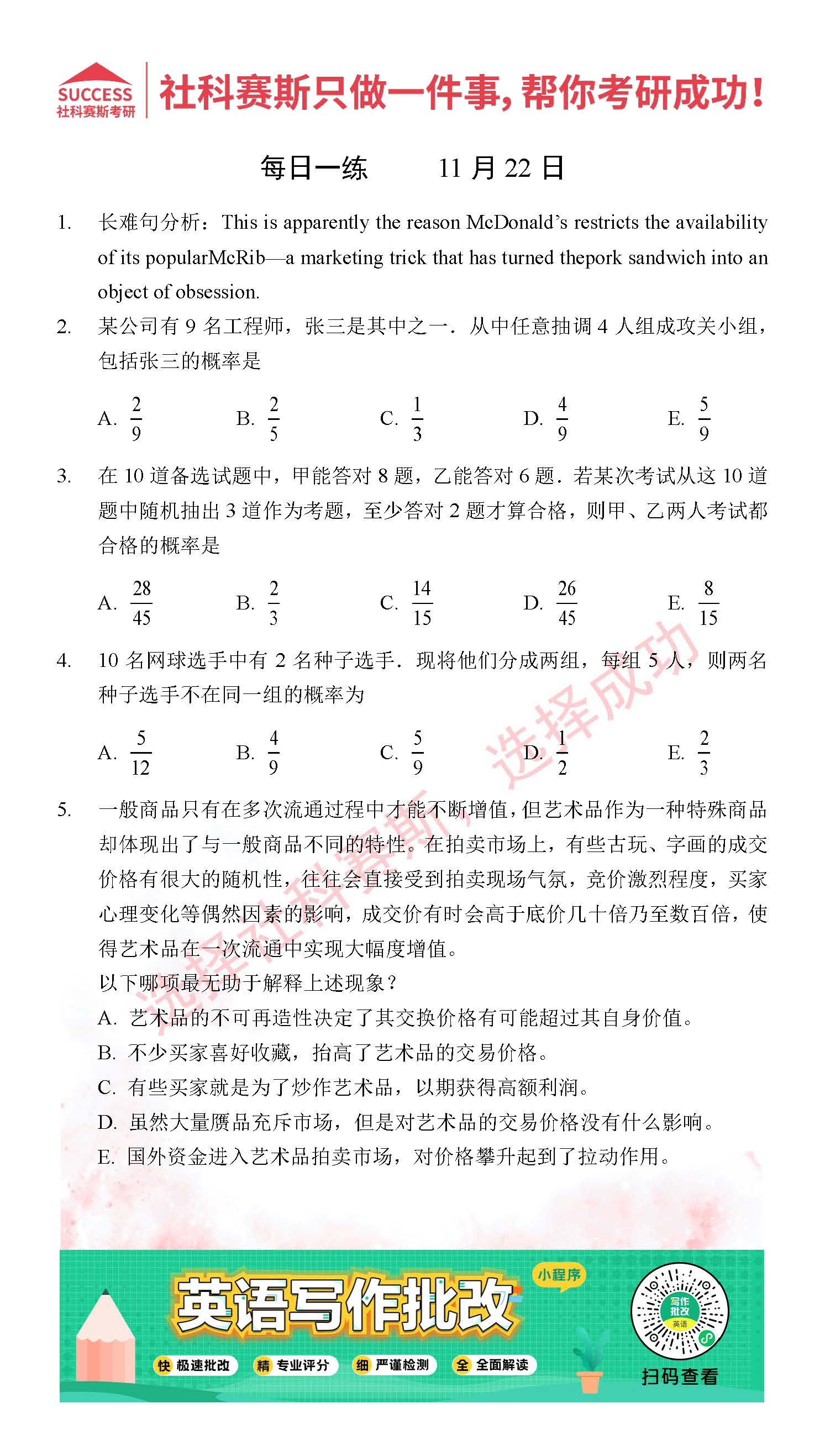 考研是一場(chǎng)持久戰(zhàn),保持良好的學(xué)習(xí)習(xí)慣,是能確保復(fù)習(xí)高效的關(guān)鍵。今天社科賽斯MBA備考網(wǎng)小編整理了“2021管理類聯(lián)11月22日每日一練及答案”的內(nèi)容,希望能對(duì)廣大考生有所幫助。