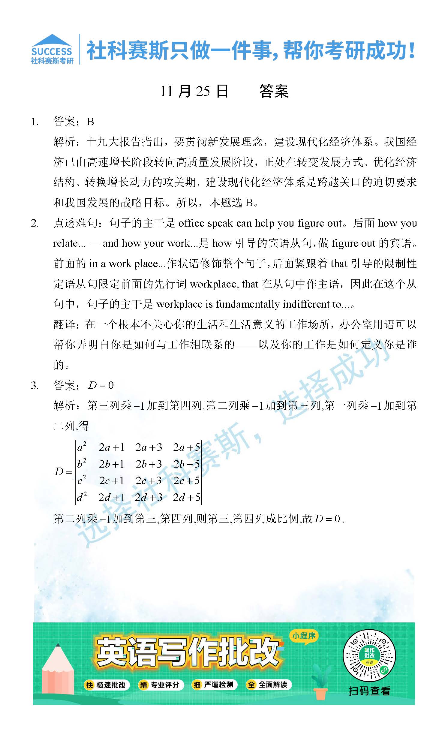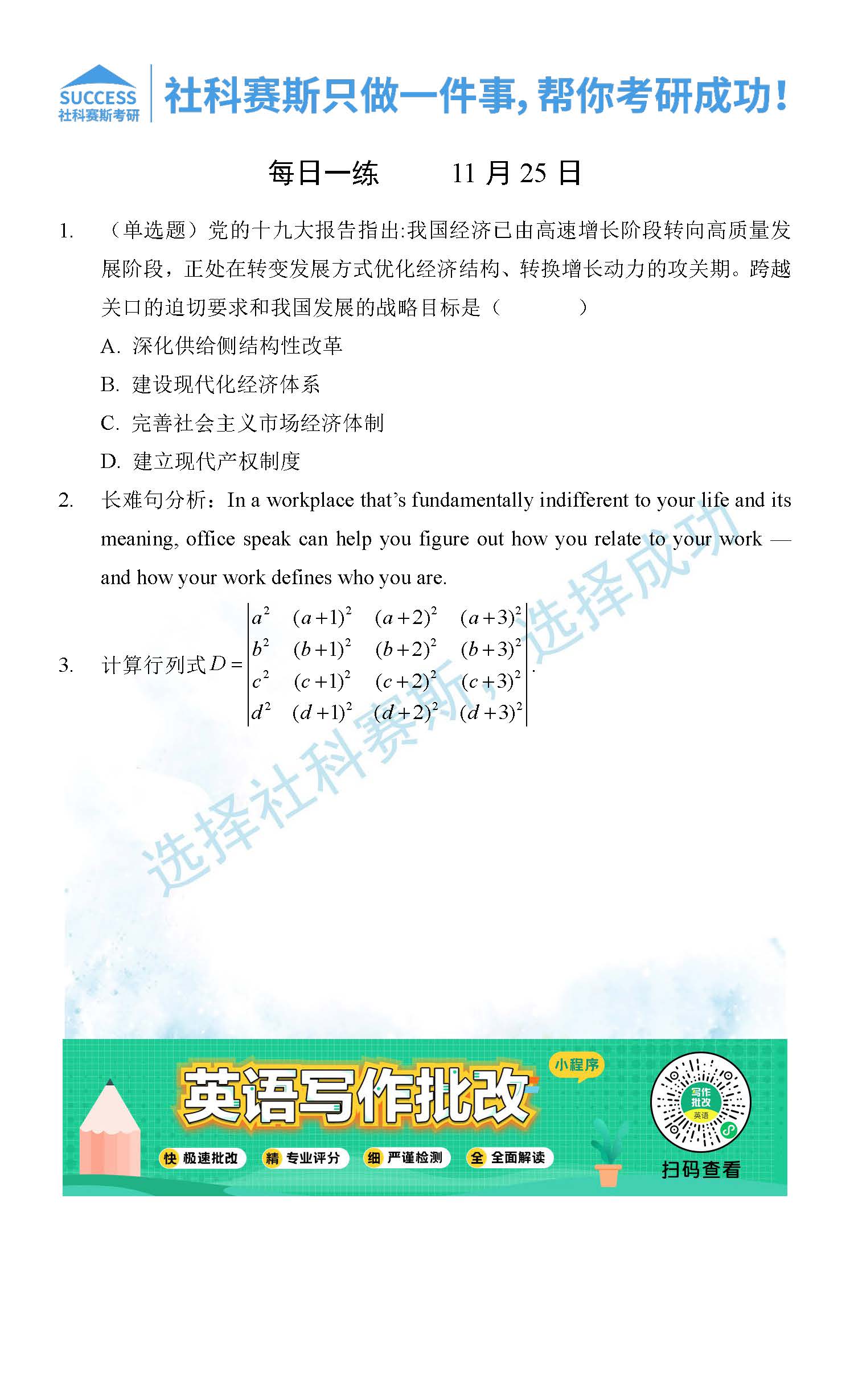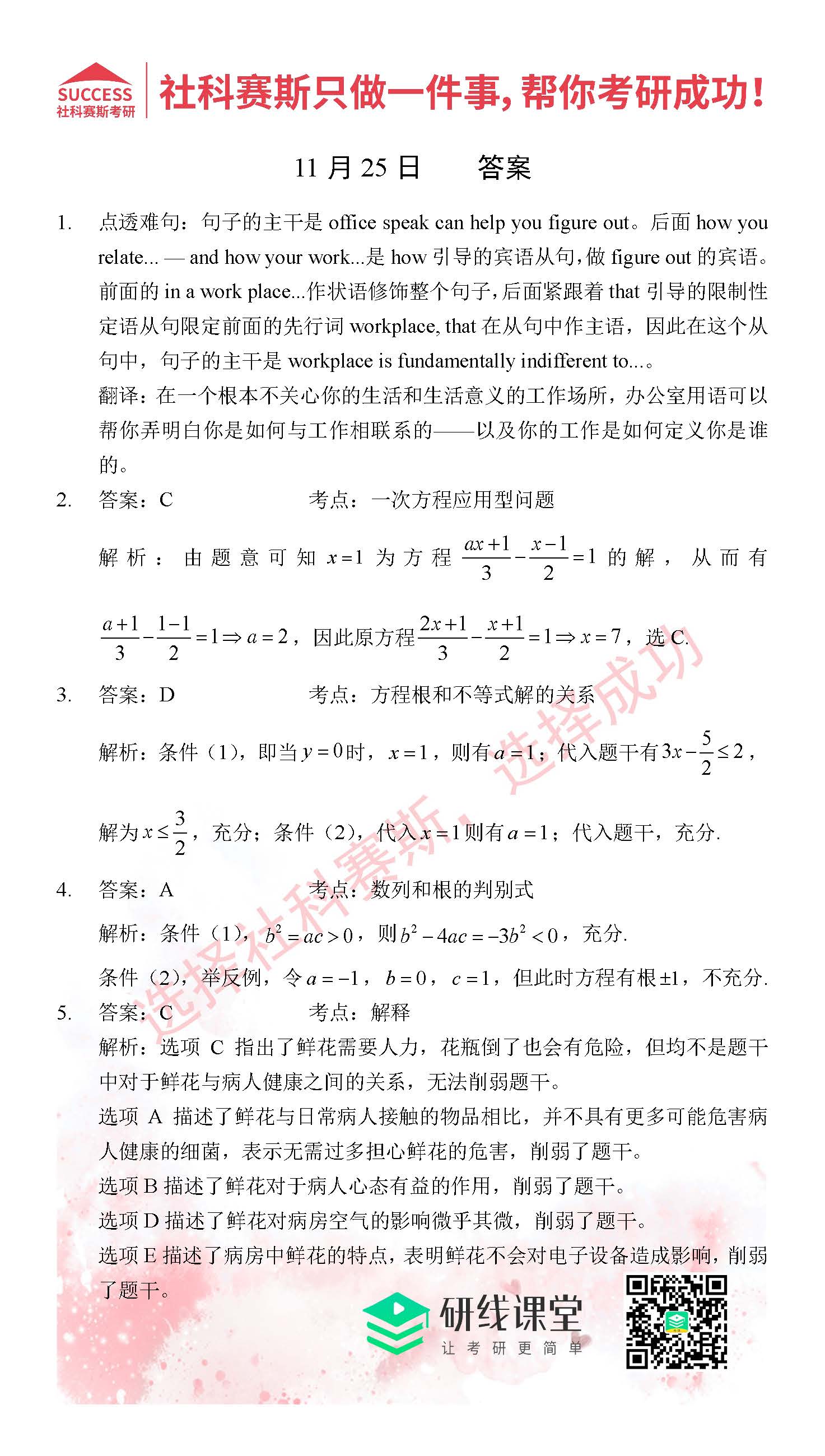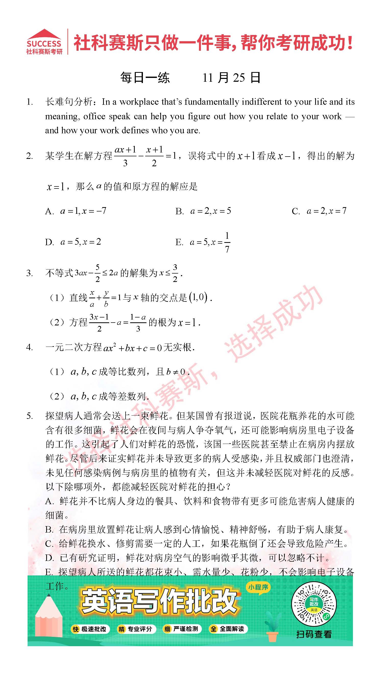 考研是一場(chǎng)持久戰(zhàn),保持良好的學(xué)習(xí)習(xí)慣,是能確保復(fù)習(xí)高效的關(guān)鍵。今天社科賽斯MBA備考網(wǎng)小編整理了“2021管理類聯(lián)11月25日每日一練及答案”的內(nèi)容,希望能對(duì)廣大考生有所幫助。