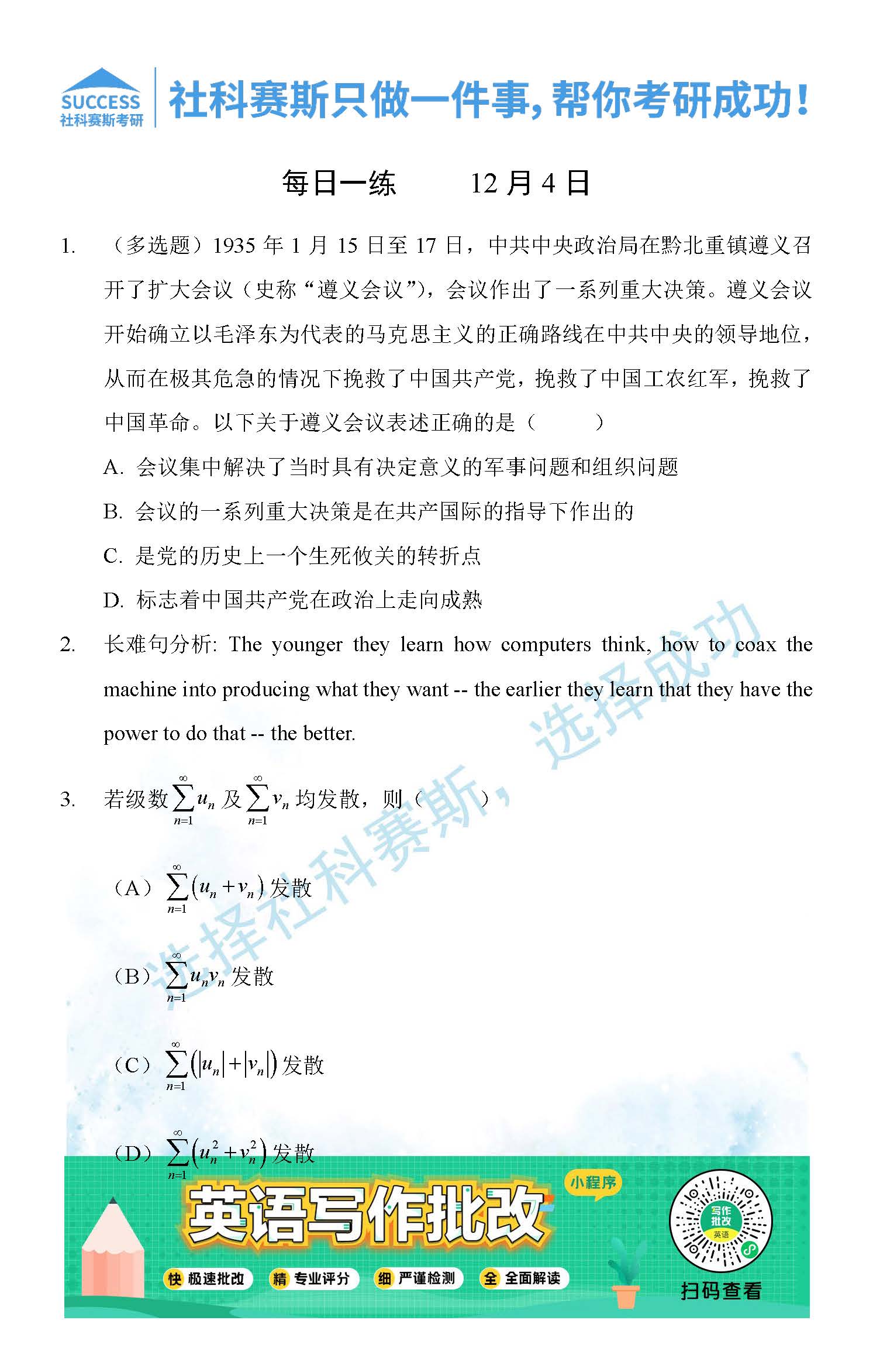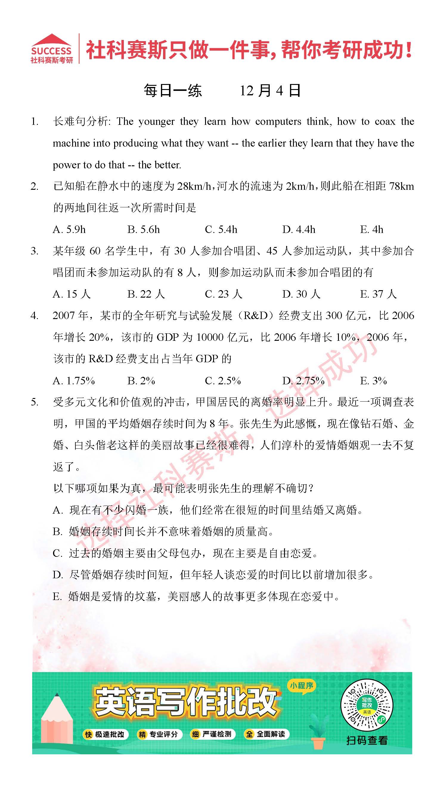 導讀:考研是一場持久戰,保持良好的學習習慣,是能確保復習高效的關鍵。今天社科賽斯MBA備考網小編整理了“2021管理類聯12月4日每日一練及答案”的內容,希望能對廣大考生有所幫助。