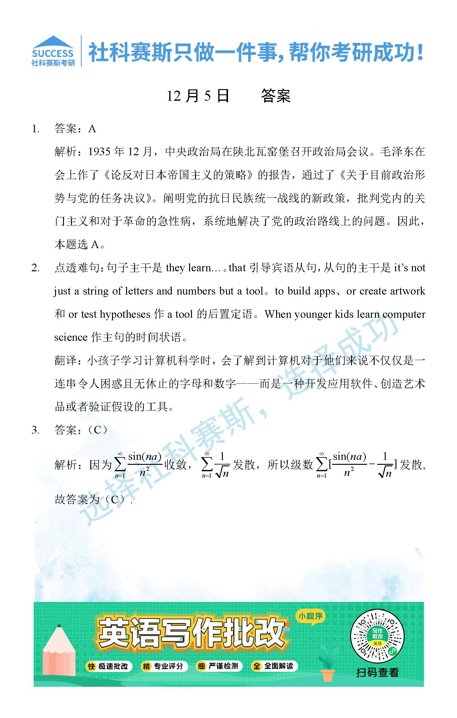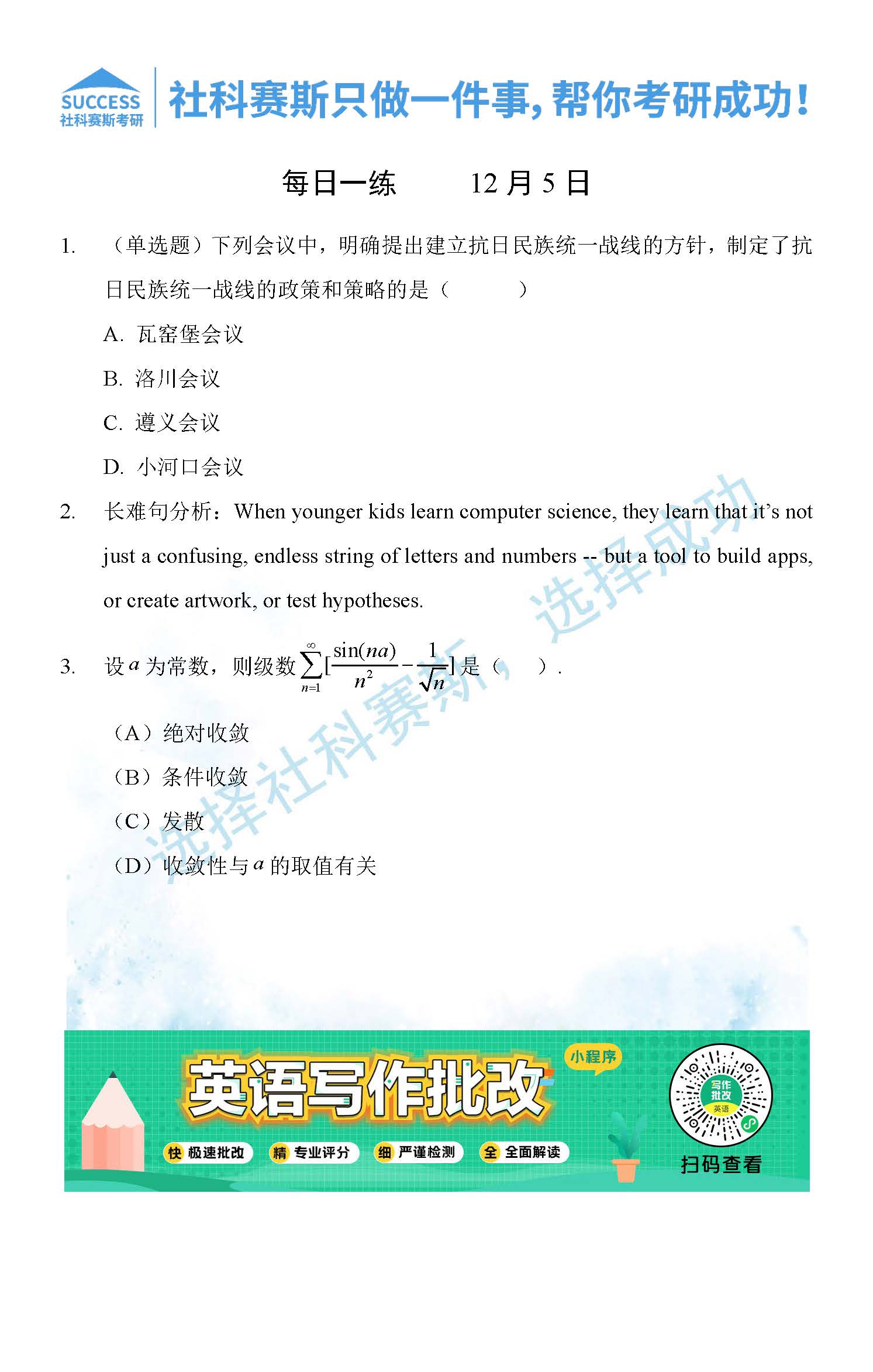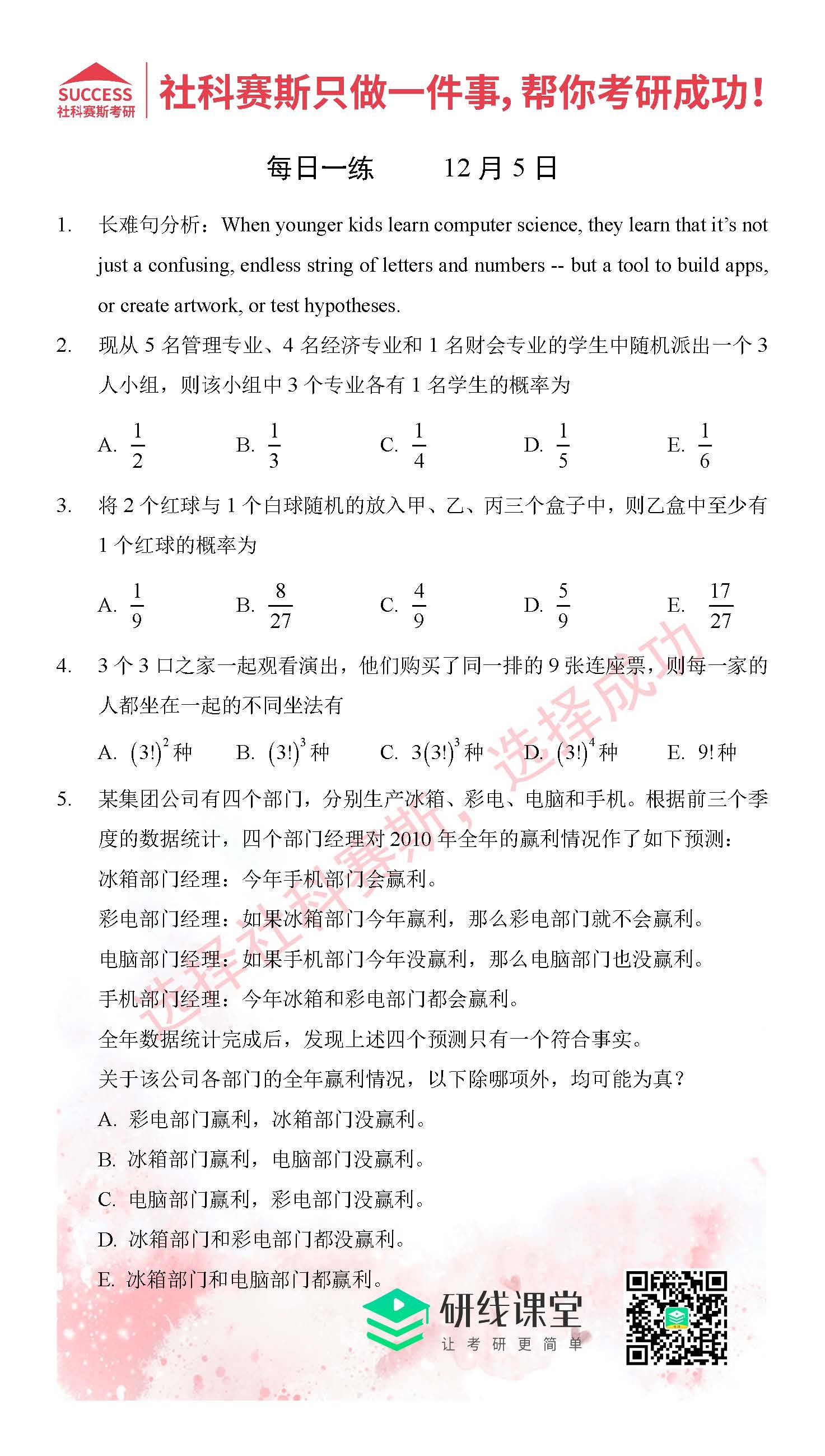 導(dǎo)讀:考研是一場(chǎng)持久戰(zhàn),保持良好的學(xué)習(xí)習(xí)慣,是能確保復(fù)習(xí)高效的關(guān)鍵。今天社科賽斯MBA備考網(wǎng)小編整理了“2021管理類聯(lián)12月5日每日一練及答案”的內(nèi)容,希望能對(duì)廣大考生有所幫助。