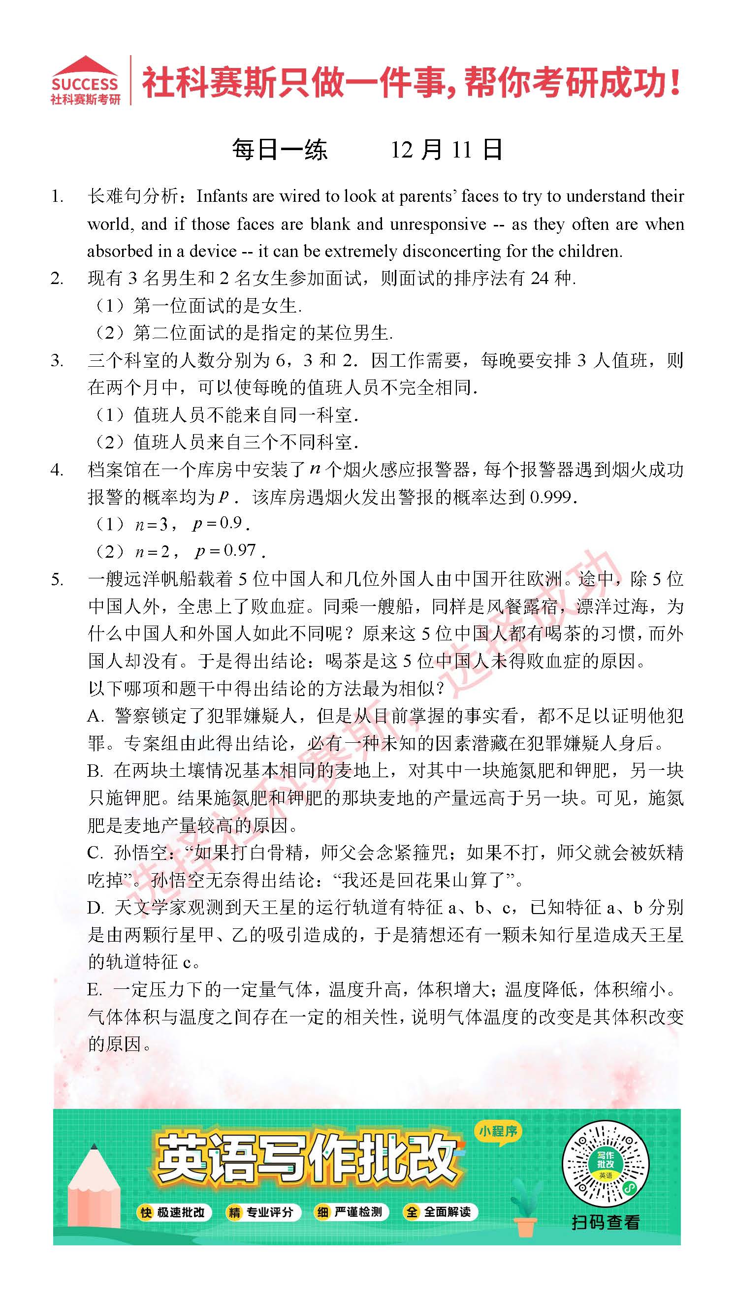 導讀:考研是一場持久戰(zhàn),保持良好的學習習慣,是能確保復習高效的關鍵。今天社科賽斯MBA備考網小編整理了“2021管理類聯(lián)12月11日每日一練及答案”的內容,希望能對廣大考生有所幫助。