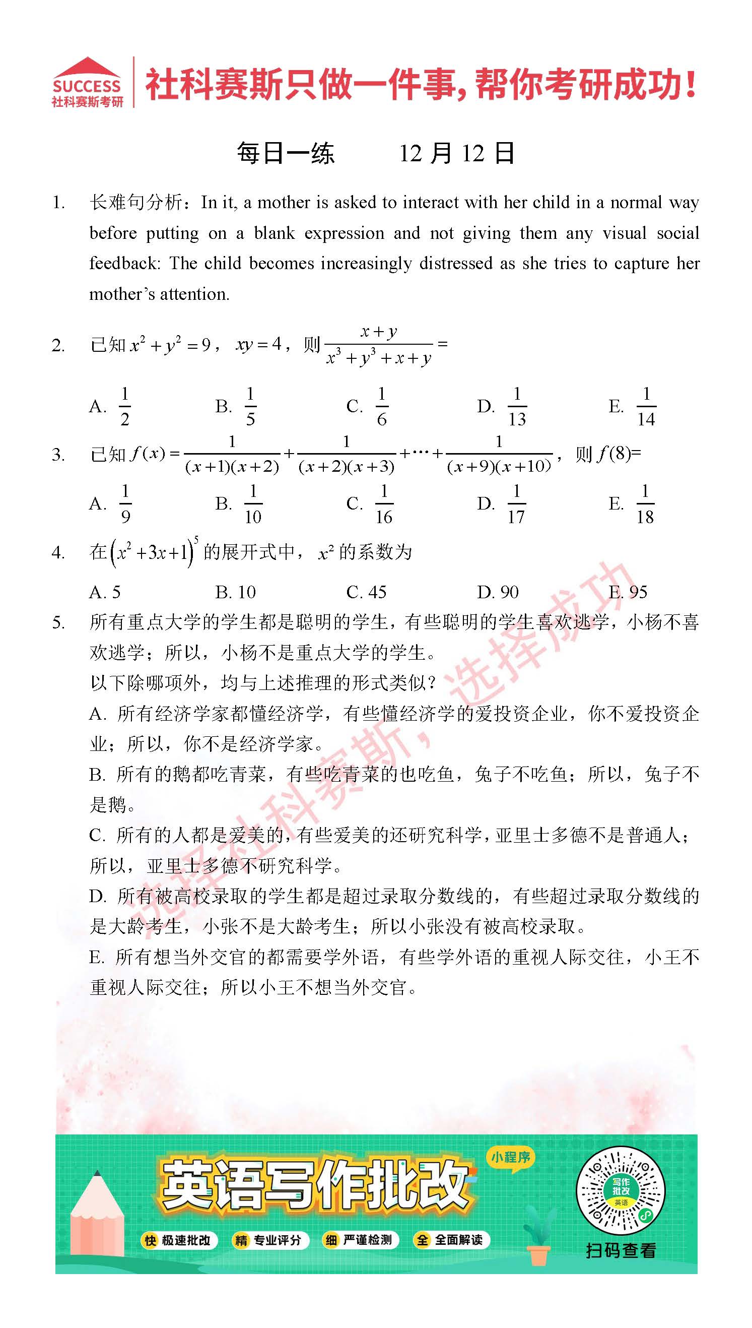 導讀:考研是一場持久戰,保持良好的學習習慣,是能確保復習高效的關鍵。今天社科賽斯MBA備考網小編整理了“2021管理類聯12月12日每日一練及答案”的內容,希望能對廣大考生有所幫助。