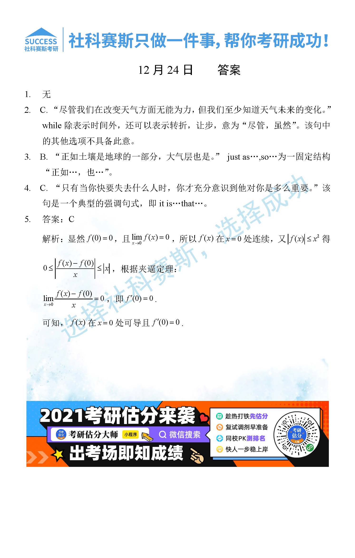 導(dǎo)讀:考研是一場(chǎng)持久戰(zhàn),保持良好的學(xué)習(xí)習(xí)慣,是能確保復(fù)習(xí)高效的關(guān)鍵。今天社科賽斯MBA備考網(wǎng)小編整理了“2021管理類聯(lián)12月24日每日一練及答案”的內(nèi)容,希望能對(duì)廣大考生有所幫助。