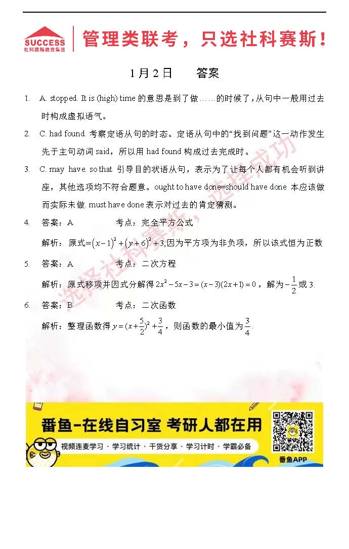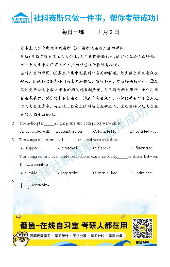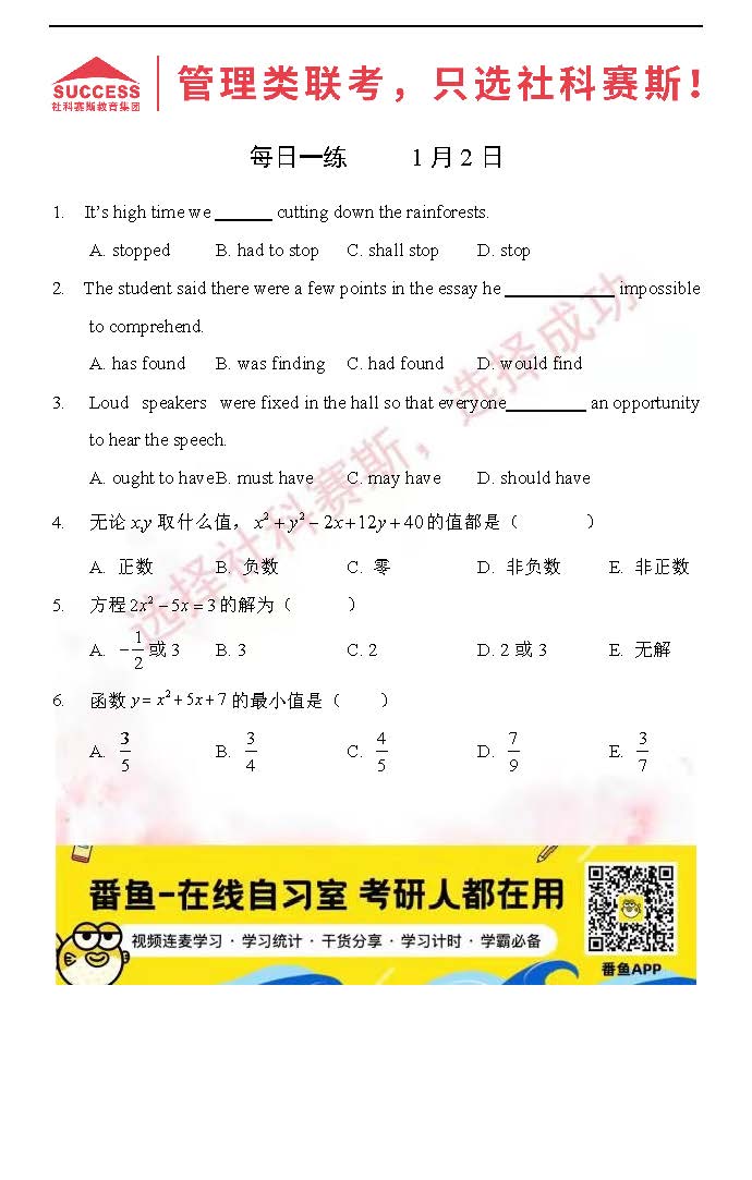 導讀:考研是一場持久戰,保持良好的學習習慣,是能確保復習高效的關鍵。今天社科賽斯MBA備考網小編整理了“2021管理類聯1月2日每日一練及答案”的內容,希望能對廣大考生有所幫助。