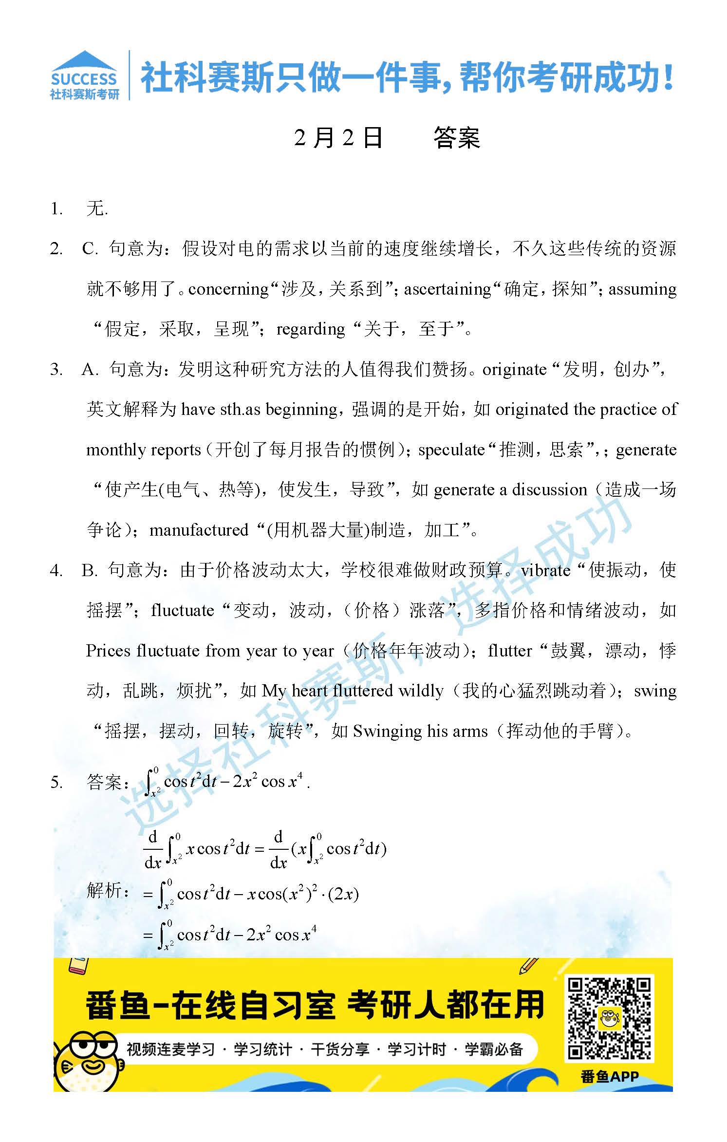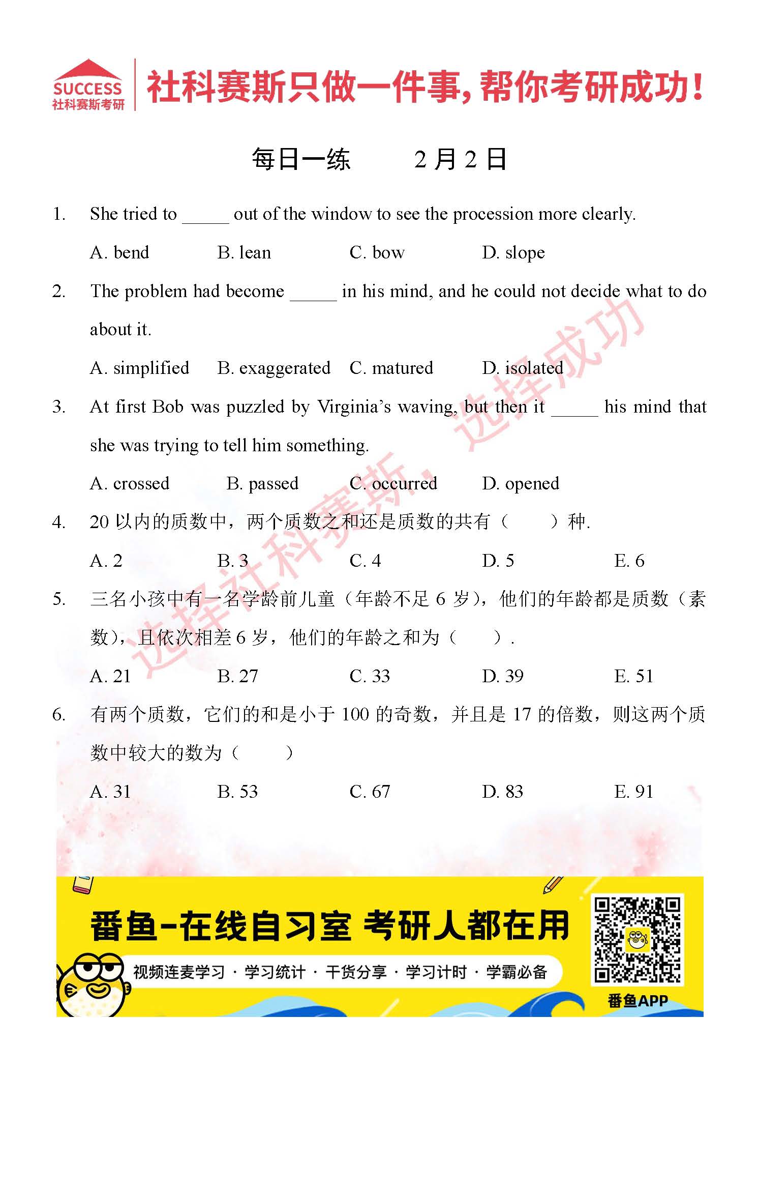 導(dǎo)讀:考研是一場(chǎng)持久戰(zhàn),保持良好的學(xué)習(xí)習(xí)慣,是能確保復(fù)習(xí)高效的關(guān)鍵。今天社科賽斯MBA備考網(wǎng)小編整理了“2022管理類聯(lián)2月2日每日一練及答案”的內(nèi)容,希望能對(duì)廣大考生有所幫助。