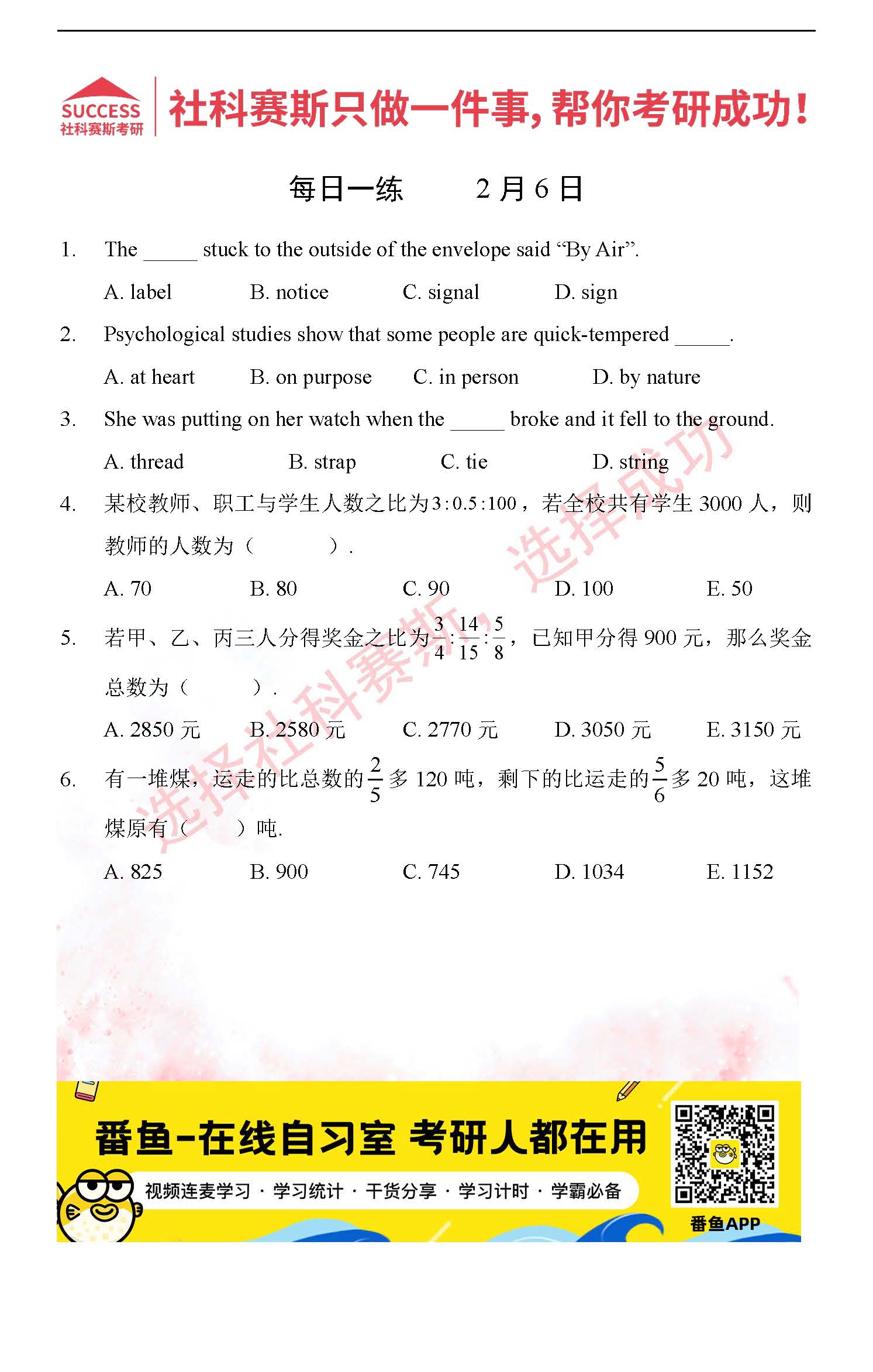 導讀:考研是一場持久戰,保持良好的學習習慣,是能確保復習高效的關鍵。今天社科賽斯MBA備考網小編整理了“2022管理類聯2月6日每日一練及答案”的內容,希望能對廣大考生有所幫助。