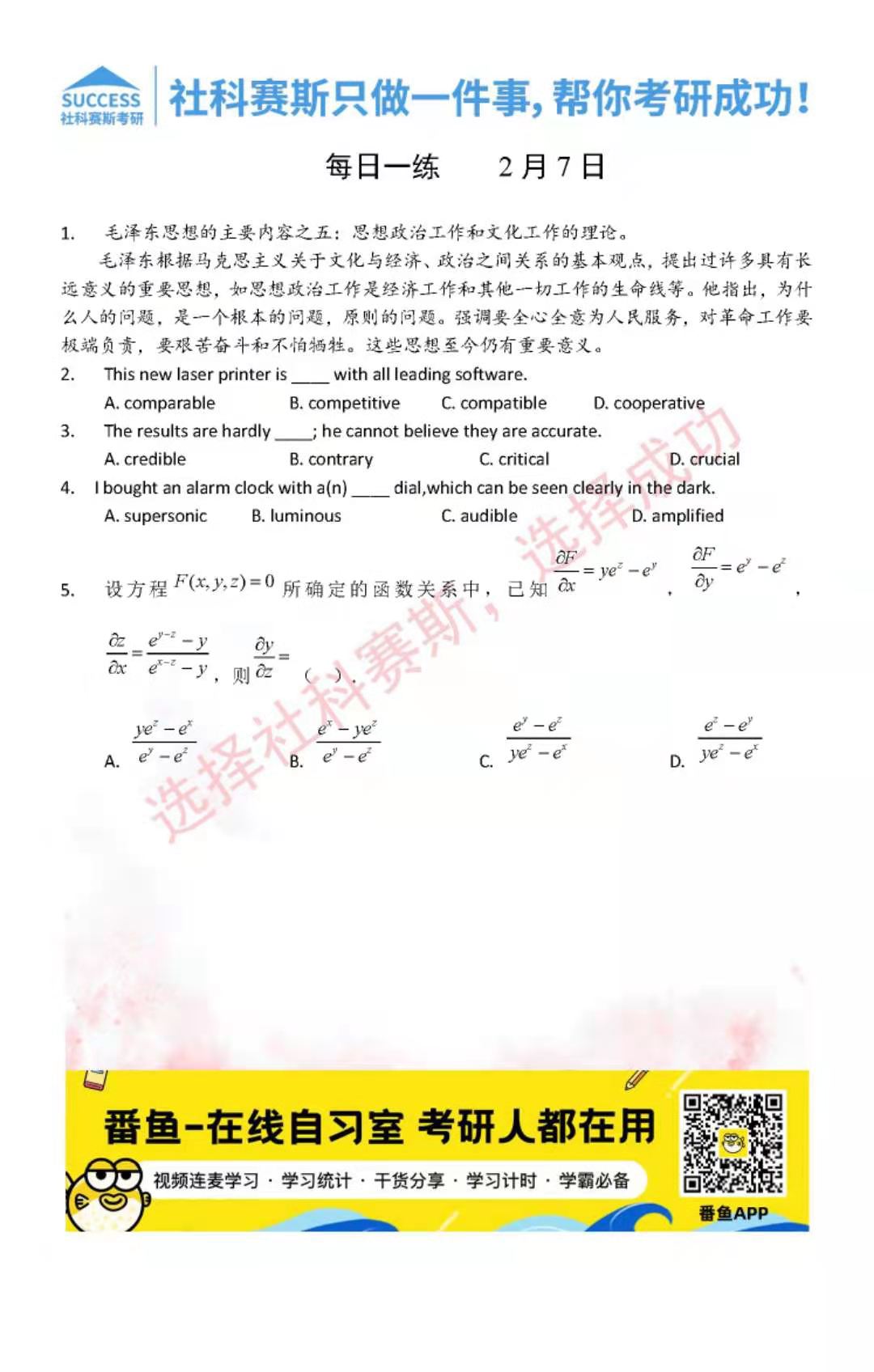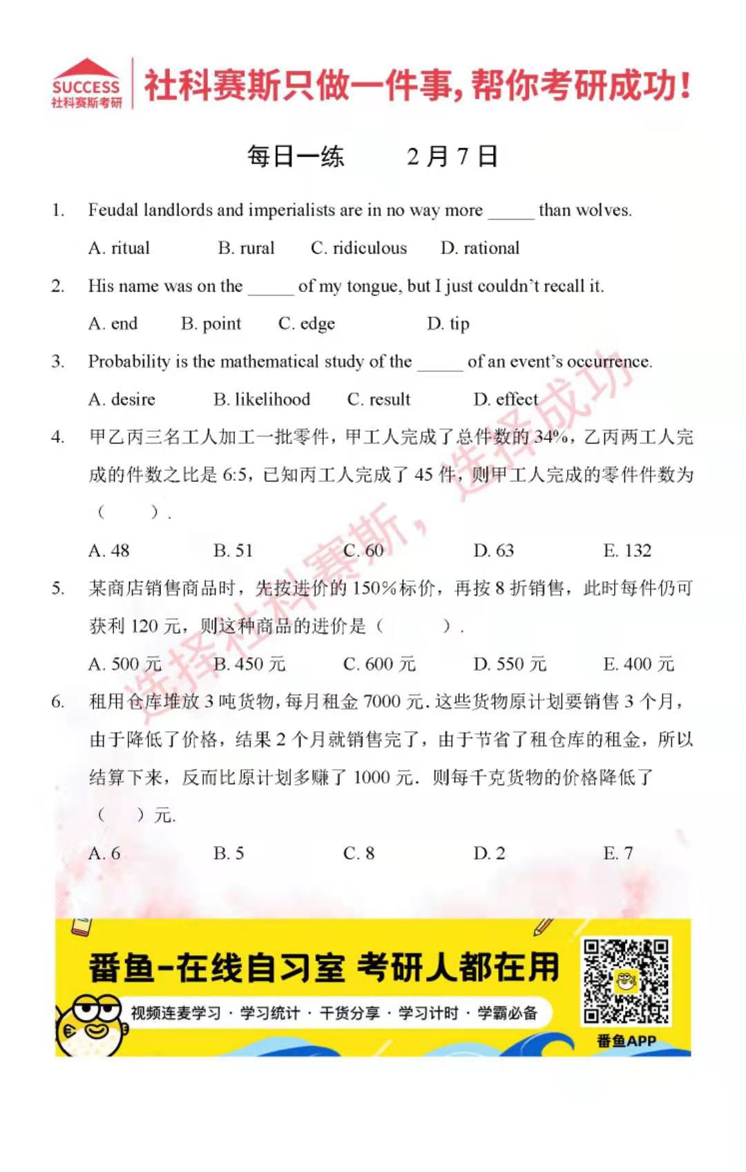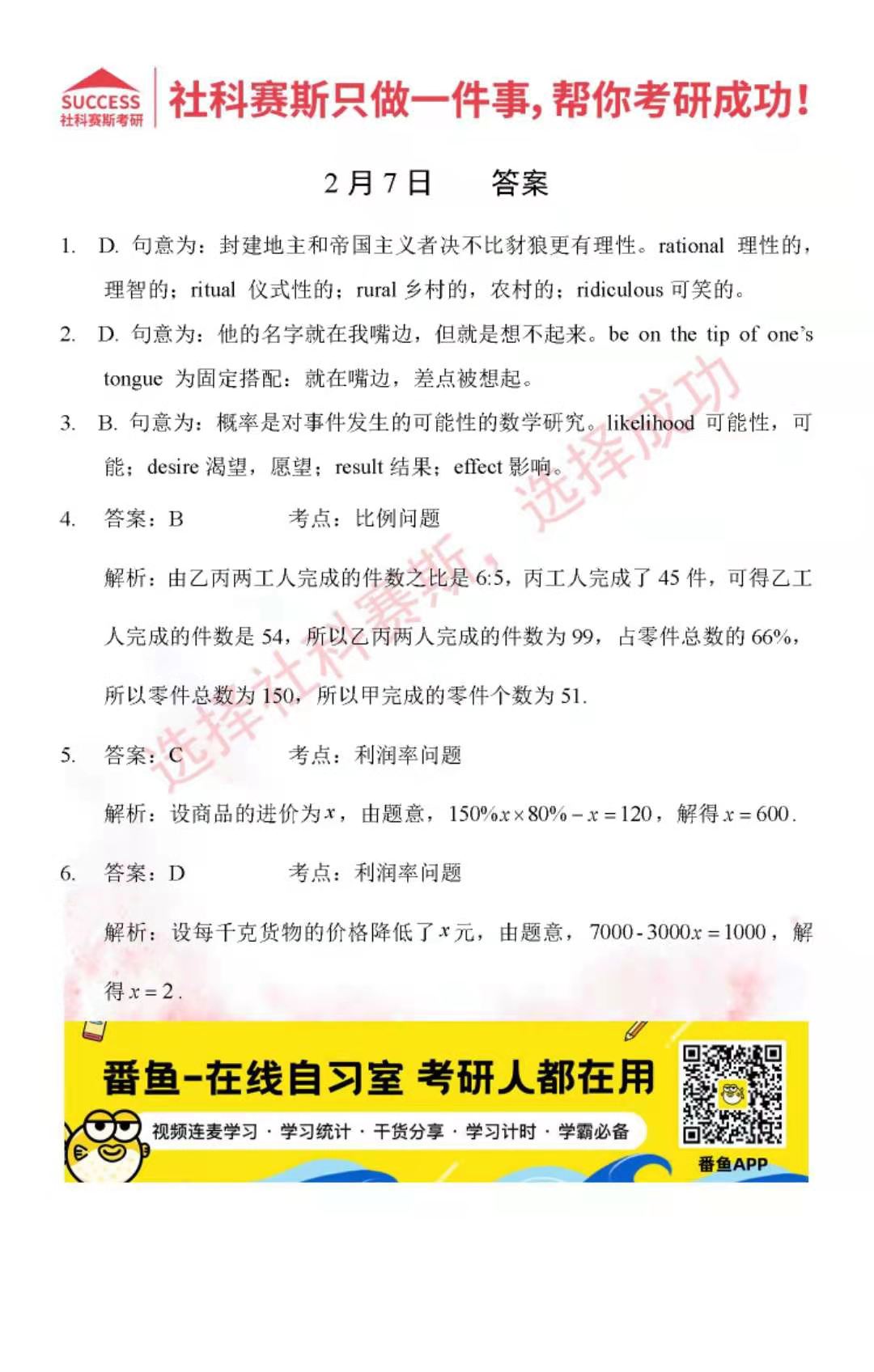 導讀:考研是一場持久戰,保持良好的學習習慣,是能確保復習高效的關鍵。今天社科賽斯MBA備考網小編整理了“2022管理類聯2月7日每日一練及答案”的內容,希望能對廣大考生有所幫助。