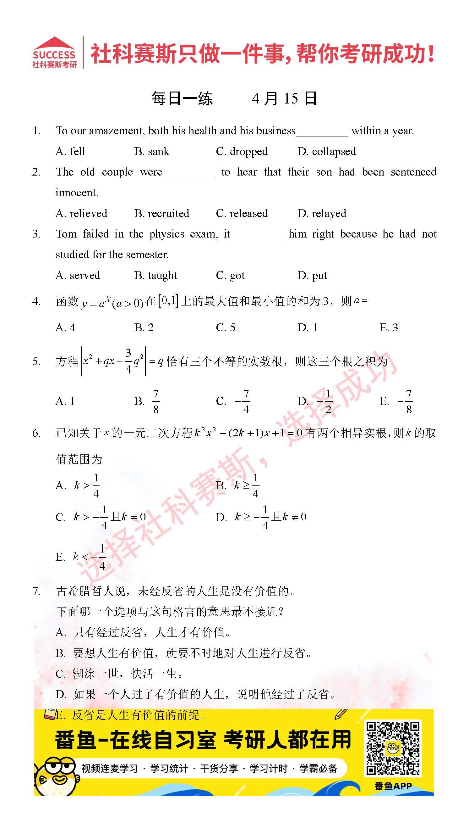 導讀:考研是一場持久戰,保持良好的學習習慣,是能確保復習高效的關鍵。今天社科賽斯MBA備考網小編整理了“2022管理類聯考4月15日每日一練及答案”的內容,希望能對廣大考生有所幫助。
