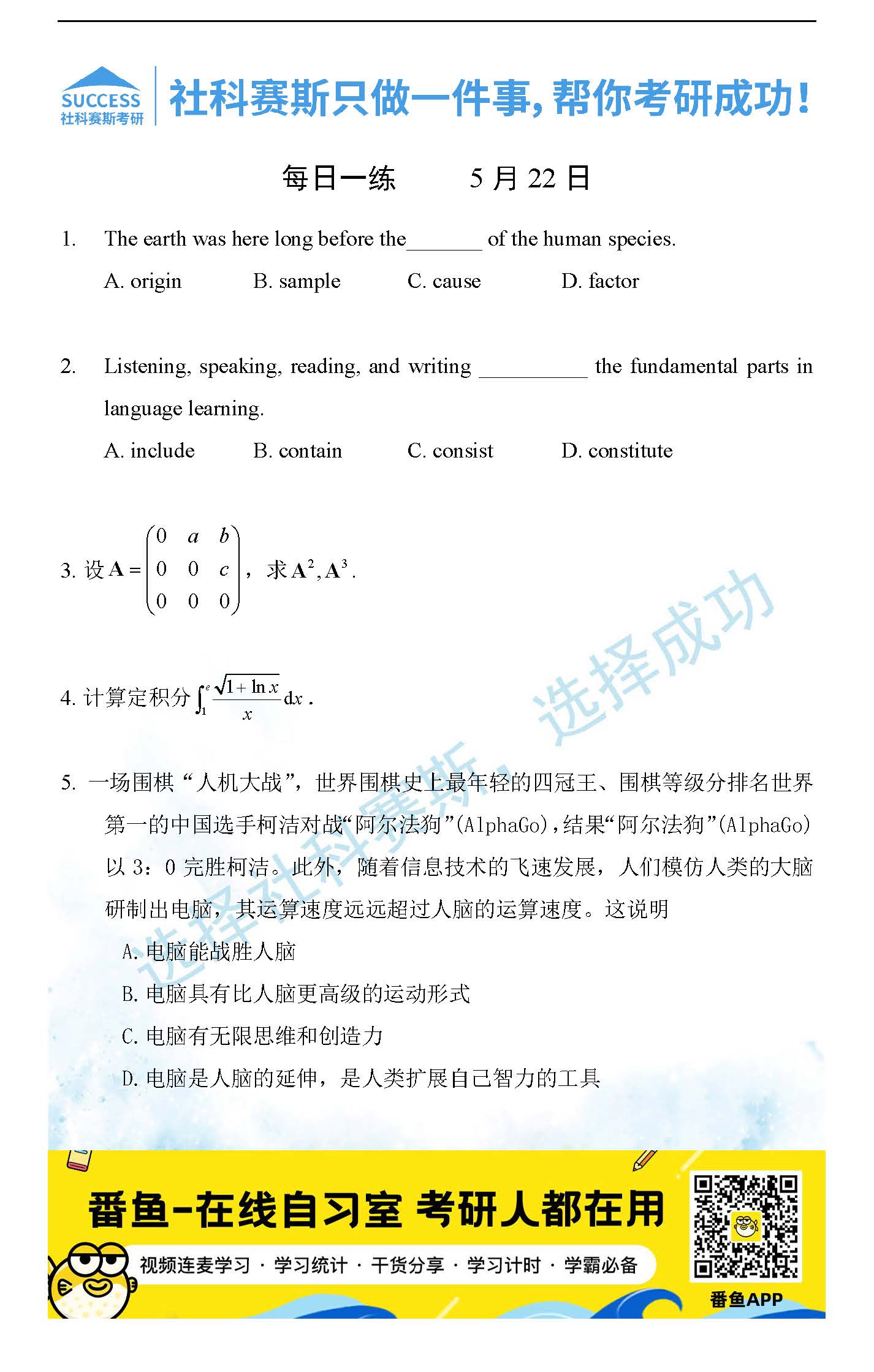 導(dǎo)讀:考研是一場(chǎng)持久戰(zhàn),保持良好的學(xué)習(xí)習(xí)慣,是能確保復(fù)習(xí)高效的關(guān)鍵。今天社科賽斯MBA備考網(wǎng)小編整理了“2022管理類聯(lián)考5月22日每日一練及答案”的內(nèi)容,希望能對(duì)廣大考生有所幫助。