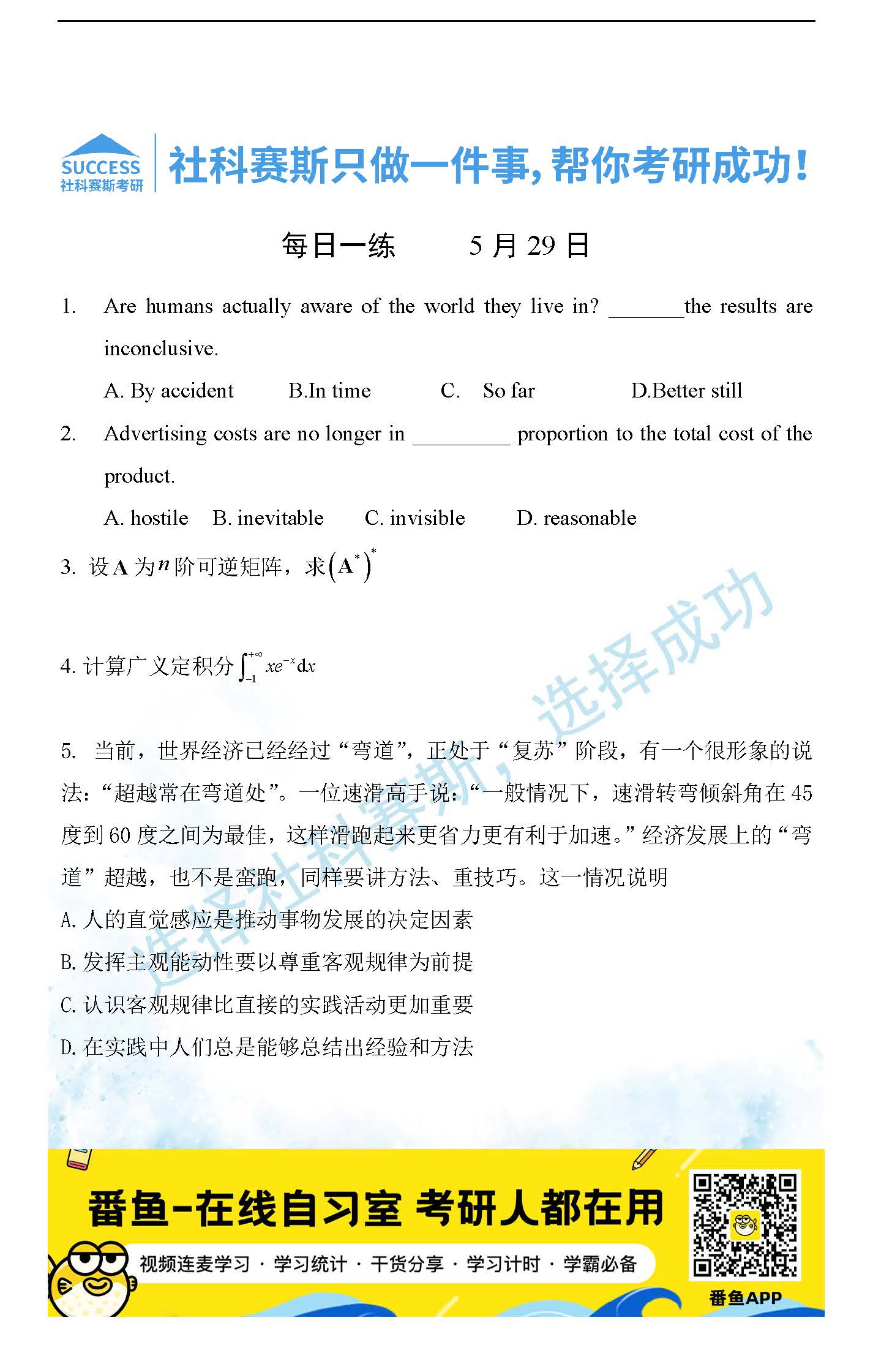 導(dǎo)讀:考研是一場(chǎng)持久戰(zhàn),保持良好的學(xué)習(xí)習(xí)慣,是能確保復(fù)習(xí)高效的關(guān)鍵。今天社科賽斯MBA備考網(wǎng)小編整理了“2022管理類聯(lián)考5月29日每日一練及答案”的內(nèi)容,希望能對(duì)廣大考生有所幫助。