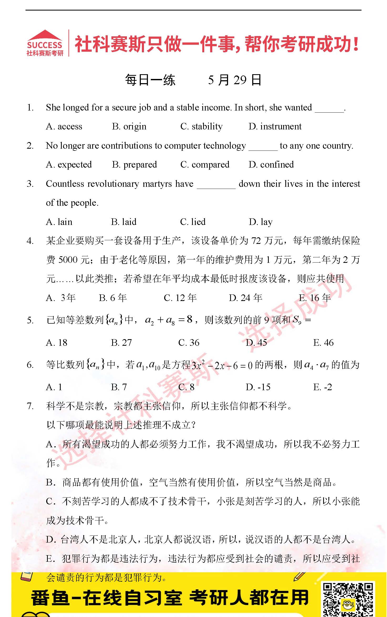 以上就是社科賽斯MBA備考網(wǎng)小編為大家整理“2022管理類聯(lián)考5月29日每日一練及答案”的全部?jī)?nèi)容,希望各位考生堅(jiān)持利用起來,更多每日一練內(nèi)容請(qǐng)持續(xù)關(guān)注MBA備考網(wǎng)管理類聯(lián)考每日一練。