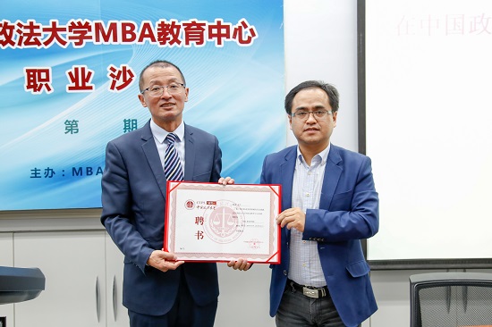 隨后,在熱烈的掌聲中,"MBA職業導師聘任儀式"正式開始,中國政法大學MBA中心肖富榮老師代表院方授予甄誠董事長"MBA職業導師”聘書。這也是繼被聘任為北京交通大學、首都經濟貿易大學、中國科學院大學、北京師范大學面試考官、兼職教授、職業發展導師之后,甄董與院校的再一次親密合作。甄董同時表示今后將對中國政法MBA教育給予大力支持,為同學們之后的發展提供幫助,切實擔負起職業導師的責任。
