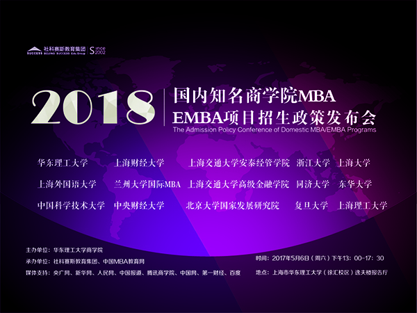 導讀:2016年5月6日,社科賽斯教育集團、中國MBA教育網將聯合上海、北京、浙江、安徽等15所院校,聯合承辦“國內知名商學院MBA項目(2018)招生政策發布會”。