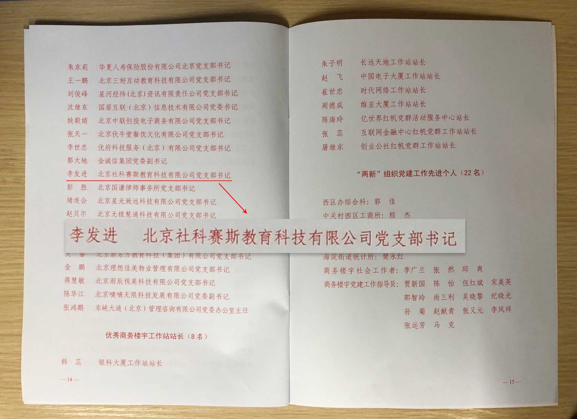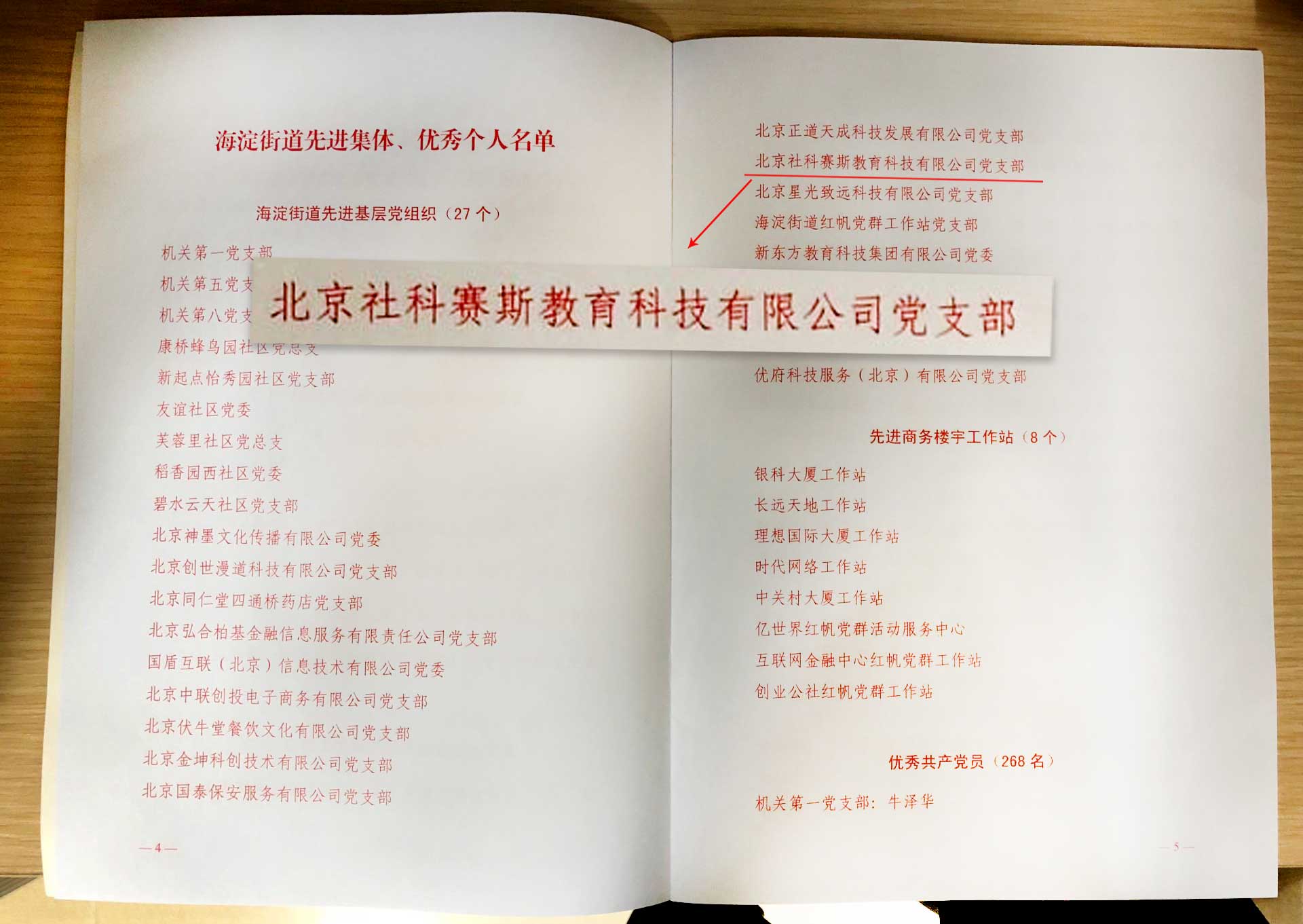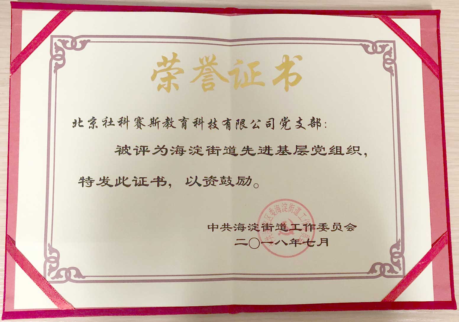 在北京北京社科賽斯黨支部不懈的努力下,我們取得了可喜的成績:北京北京社科賽斯黨支部被評為海淀街道先進基層黨組織,北京北京社科賽斯黨支部書記李發進被評為海淀街道優秀黨務工作者,北京北京社科賽斯黨支部組織委員王雅崯被評為海淀街道優秀共產黨員。一個一個的榮耀接踵而來。不僅是對黨員的鼓勵,也是對北京社科賽斯每一位員工的鼓勵,這不是終點,而是起點,是我們找到了黨組織領導的正確方向,是我們邁向輝煌的重要起跑線。