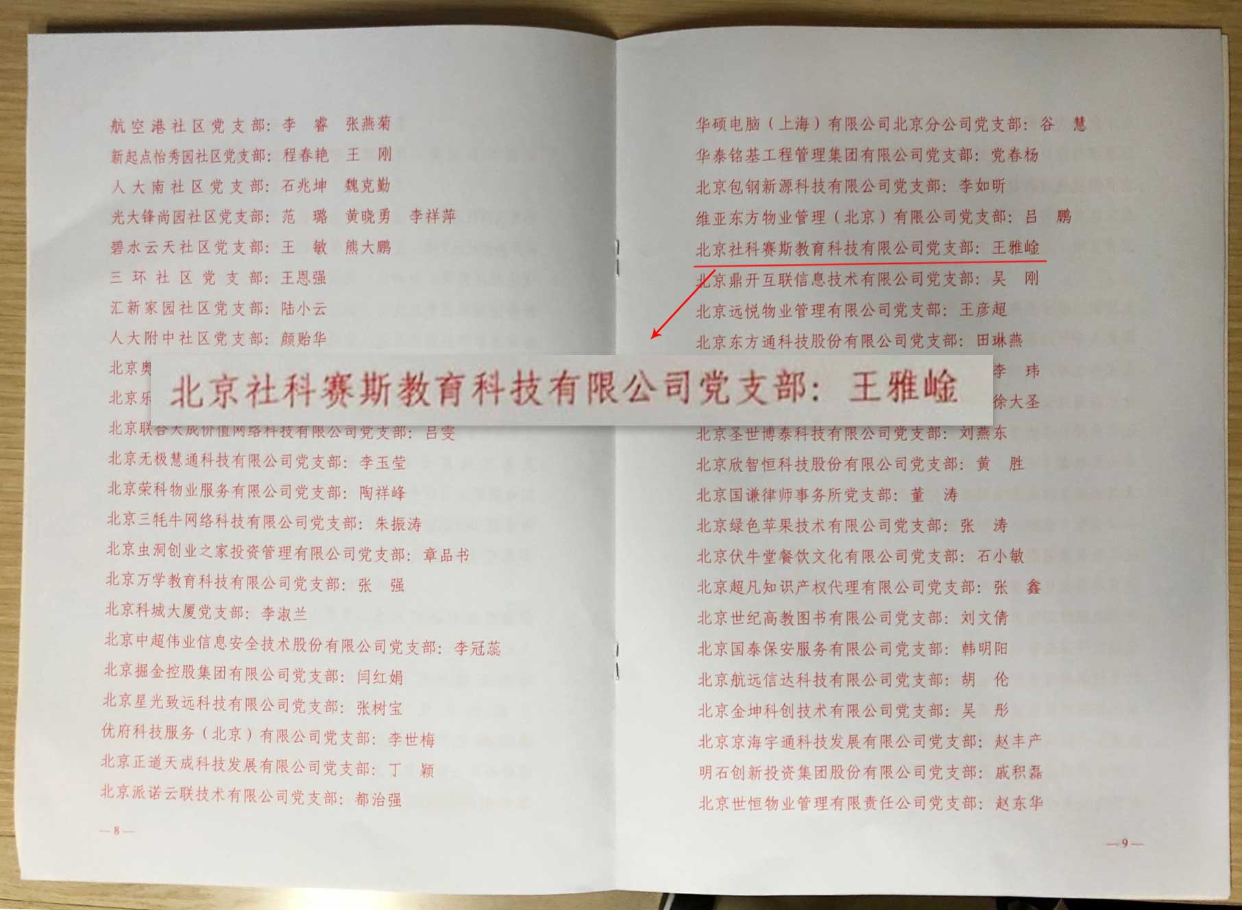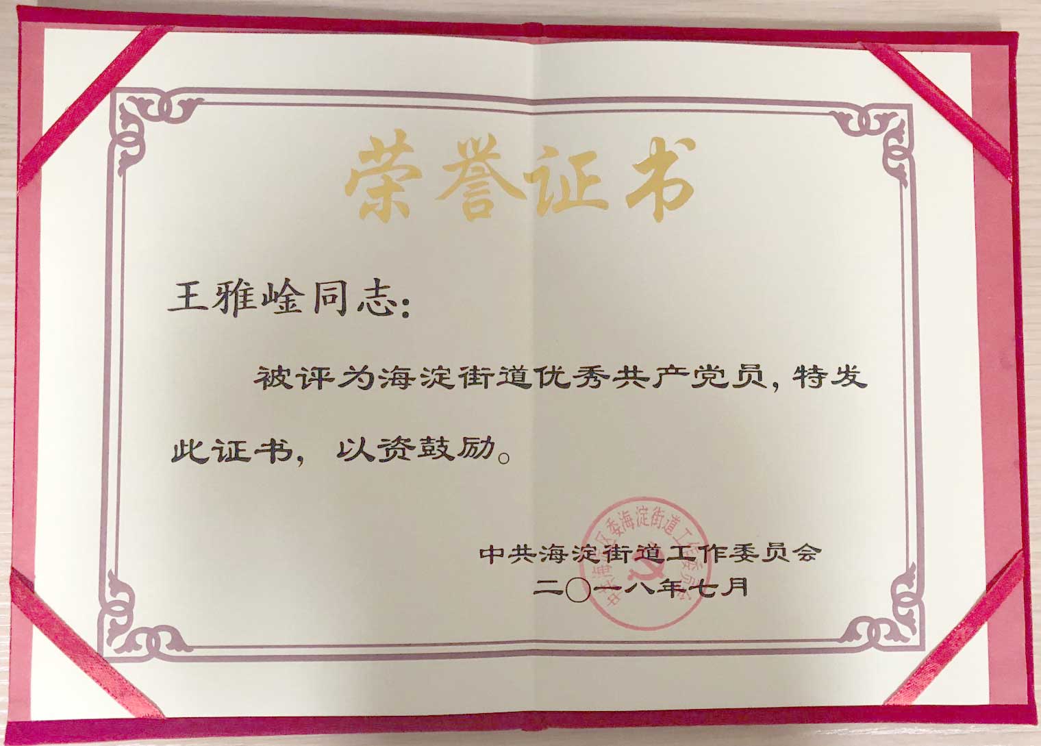 北京北京社科賽斯黨支部組織委員王雅崯被評為海淀街道優秀共產黨員