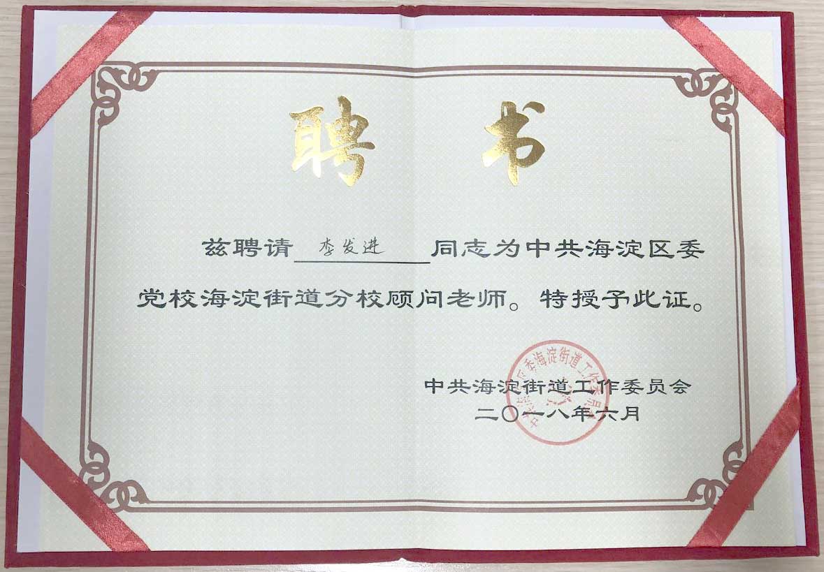 北京北京社科賽斯黨支部書記李發進被評為海淀街道分校顧問老師