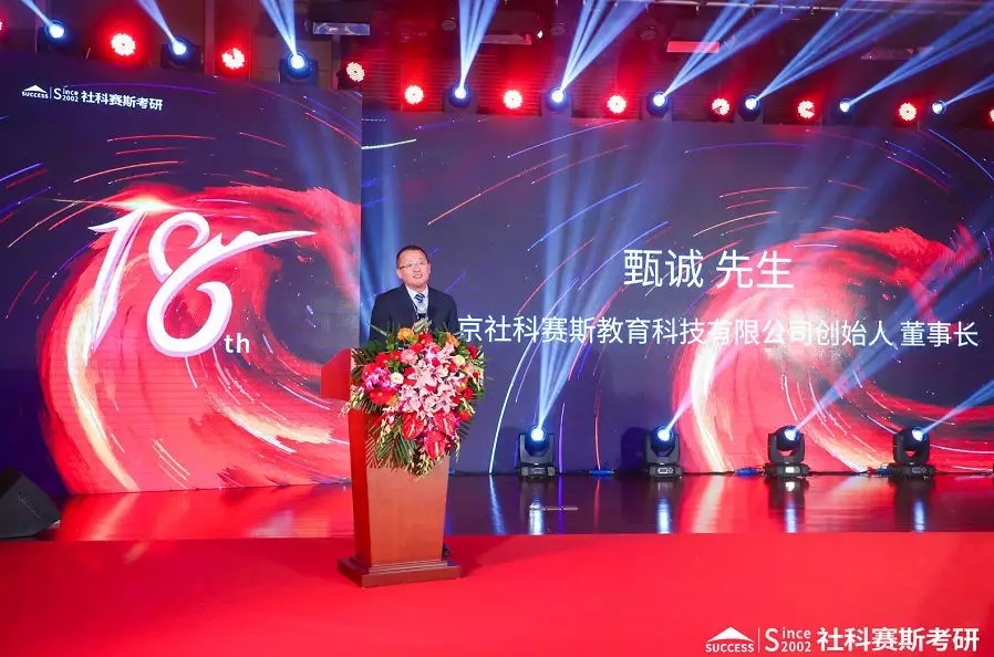 甄誠董事長首先感謝來自全國各地的嘉賓和親人相聚于此,社科賽斯風風雨雨十八年,源于家人們的眾志長城,艱苦奮斗,使我們進入考研領域的快車道。也非常感謝在場朋友們的見證、支持、督促,使我們社科賽斯能夠茁壯成長。最后,甄總對與會領導,嘉賓,家人致以新年的祝福,并用習總書記的話勉勵社科賽斯人,萬眾一心加油干,越是艱險越向前,只爭朝夕,不負韶華,2020,共同拼搏出社科賽斯的新輝煌!