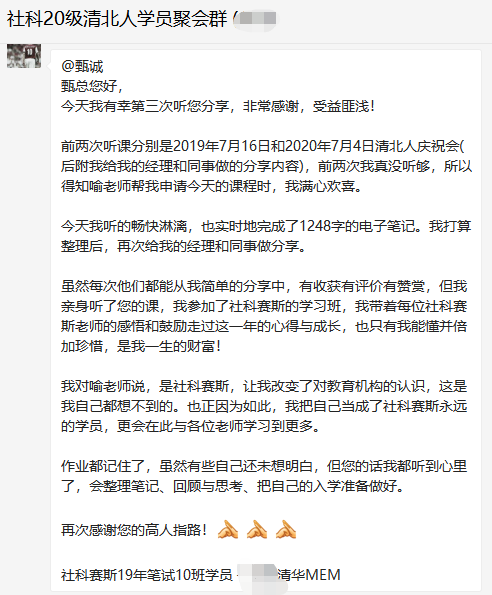 MBA學費的三分之一的價值。很多前沿的思想、前沿的知識都在第二課堂。甄總分享了清華MBA學生郝小龍,通過自己的深度思考和努力,獲得參加以美國國務卿賴斯女士為主講嘉賓的高端會議的故事,并總結了聽講座的技巧和方法論,同時希望大家珍惜每一次聽講座的機會。