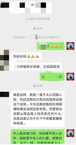 “你認識的人有多少,你的世界就有多大”。甄總認為,結交高人成大事,結交小人不壞事,要拒絕無效社交。甄總建議,把微信當做人脈拓展的利器,并展示了和多位學員的聊天記錄,向大家示范了微信溝通過程中必備的措辭,結構,語氣等,內(nèi)容極為精彩。