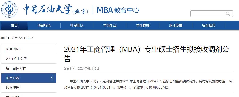 導讀:近期部分院校已開啟“預調劑系統”,下面為同學們整理出“2021MBA調劑:中國石油大學(北京)2021年工商管理(MBA)專業碩士招生擬接收調劑公告”的相關信息,趕緊一起看看,把握好時機,今年升研一吧!