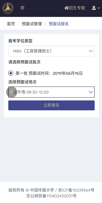 第四步:點擊“預面試報名”,選擇“學位類型、批次、場次”,提交信息,報名成功!