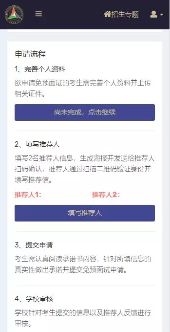 第四步:填寫推薦人。考生必須填寫2名推薦人,生成推薦海報并發送給推薦人掃碼確認。推薦人通過掃碼驗證身份后,填寫推薦信。