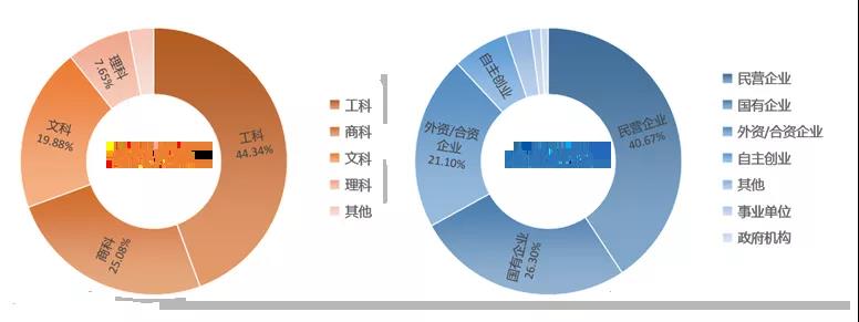 學科分布,工科、商科、文科、理科都占有一定的比例,工科占比最高;企業(yè)性質(zhì)以民營企業(yè)為主,其次是國有,外資企業(yè),企業(yè)性質(zhì)較為多樣。