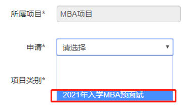 1. “申請項(xiàng)目”中的“申請”模塊須選擇“2021年入學(xué)MBA預(yù)面試”;