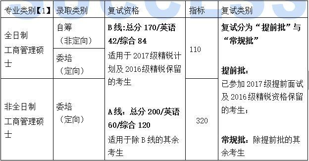 (1)所有參加面試考生按照全日制工商管理碩士、非全日制工商管理碩士分別排名,按優(yōu)先錄取第一專業(yè)志愿考生(即在中國研究生招生信息網(wǎng)上所填報(bào)的專業(yè)類別)原則,以總成績(聯(lián)考成績×50%+復(fù)試成績×50%)實(shí)行從高到低順序錄取,總成績相同的考生,則按照考生類別(即精銳計(jì)劃、新銳計(jì)劃、未參加提前面試的考生)依次進(jìn)行錄取。同一類別考生,若總成績相同,則按照“政治+英語”的復(fù)試成績進(jìn)行排名,從高到低依次錄取。