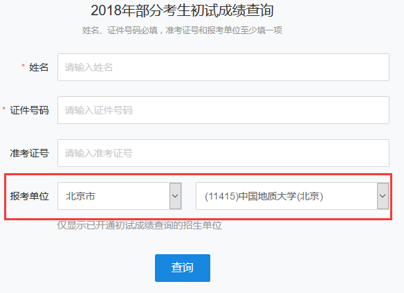 以下是中國(guó)地質(zhì)大學(xué)(北京),2018年全國(guó)碩士研究生考試成績(jī)查詢?nèi)肟?/span>(https://yz.chsi.com.cn/apply/cjcx/)