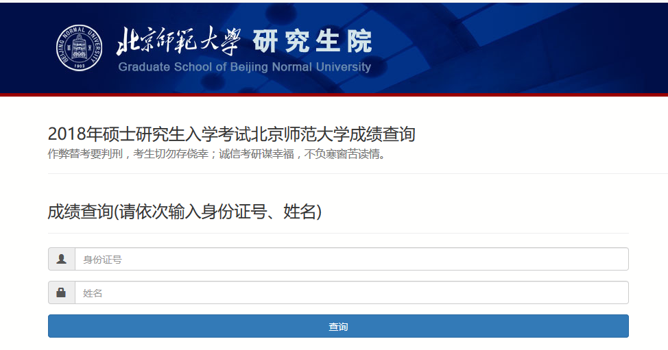以下是北京師范大學,2018年全國碩士研究生考試成績查詢?nèi)肟?/span>(http://2018.zs.graduate.bnu.edu.cn/page/sk/cjcx)