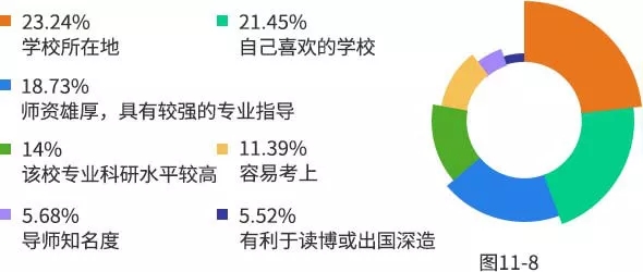 分析:從調(diào)查結(jié)果可知,學(xué)校所在地和本人對報(bào)考院校的心儀程度是大部分考生選擇報(bào)考選校的重要因素。同時,師資情況和學(xué)校考研水平的高低等軟件條件也是考生們非常關(guān)注的因素。
