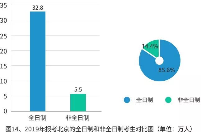 32.8萬人報(bào)考全日制碩士研究生,約占85.6%;5.5萬人報(bào)考非全日制碩士研究生,約占14.4%。