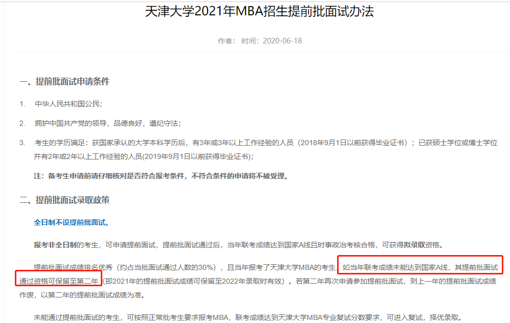 提前批面試成績排名優(yōu)秀(約占當(dāng)批面試通過人數(shù)的30%),且當(dāng)年報(bào)考了天津大學(xué)MBA的考生,如當(dāng)年聯(lián)考成績未能達(dá)到國家A線,其提前批面試通過資格可保留至第二年(即2021年的提前批面試成績可保留至2022年錄取時(shí)有效)。若第二年再次申請(qǐng)參加提前批面試,則上一年的提前批面試成績作廢,以第二年的提前批面試成績?yōu)闇?zhǔn)。