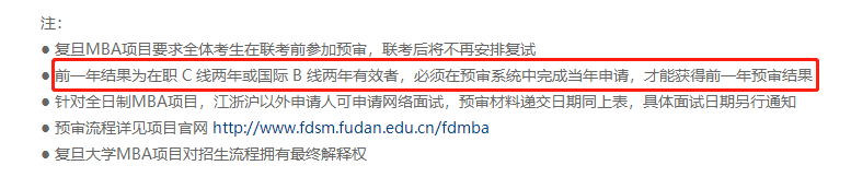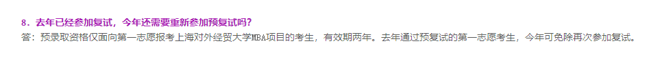 預(yù)錄取資格僅面向第一志愿報(bào)考上海對(duì)外經(jīng)貿(mào)大學(xué)MBA項(xiàng)目的考生,有效期兩年。去年通過預(yù)復(fù)試的第一志愿考生,今年可免除再次參加復(fù)試。