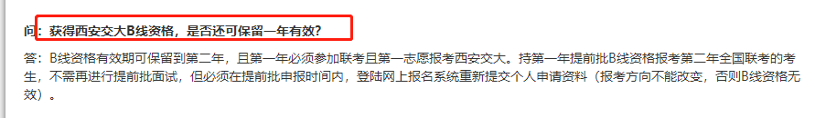 B線資格有效期可保留到第二年,且第一年必須參加聯(lián)考且第一志愿報(bào)考西安交大。持第一年提前批B線資格報(bào)考第二年全國聯(lián)考的考生,不需再進(jìn)行提前批面試,但必須在提前批申報(bào)時(shí)間內(nèi),登陸網(wǎng)上報(bào)名系統(tǒng)重新提交個(gè)人申請(qǐng)資料(報(bào)考方向不能改變,否則B線資格無效)。