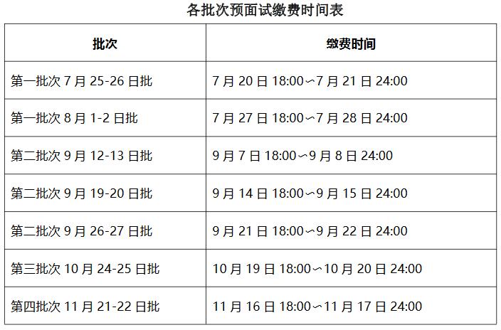 考生需根據(jù)《各批次預(yù)面試?yán)U費(fèi)時(shí)間表》中對(duì)應(yīng)的時(shí)間,按照系統(tǒng)提示繳納預(yù)面試費(fèi),預(yù)面試費(fèi)標(biāo)準(zhǔn)為90元/人次。繳費(fèi)后因各種原因未參加預(yù)面試者,已支付的預(yù)面試費(fèi)不予退還。規(guī)定時(shí)間內(nèi)未繳費(fèi)者,視為放棄預(yù)面試資格。