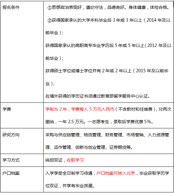 日前,北京物資學院MBA教育中心公布了2017年北京物資學院MBA招生簡章。2017年北京物資學院MBA學費為5萬元,入學享受全日制學習待遇,戶口檔案可轉入北京,畢業獲取學歷學位雙證,并享有畢業派遣。