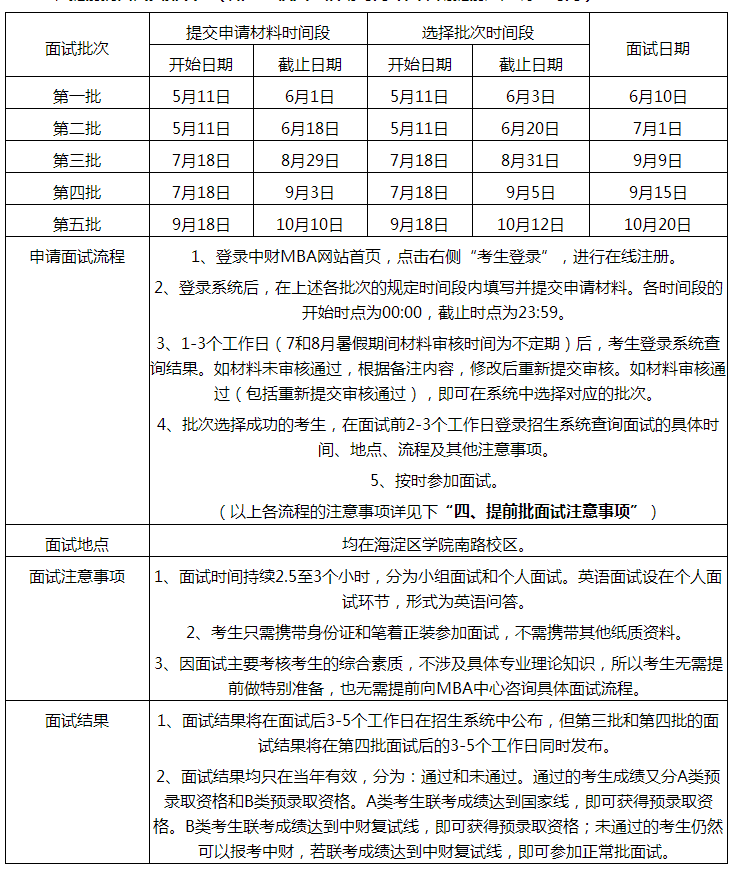 中央財經大學MBA項目致力于培養具備全球視野和創新能力,擁有金融財務優勢,積極承擔社會責任的領導者。中央財經大學MBA是國內最具競爭力和影響力的MBA項目之一,依托學校良好的社會聲譽和品牌價值,整合全校優質資源,注重發揮財經學科特色和師資優勢,取得了豐碩的辦學成果和廣泛的社會認可。2011年通過AMBA認證,成為中國大陸地區第8家、北京地區首家AMBA認證會員;2014年,通過AMBA再認證,認證有效期為5年;2017年,通過CAMEA認證,認證有效期為5年,并列第15位國內高校通過認證。同時,中央財經大學MBA項目多年多次被新華網、央廣網、騰訊網、新浪網、中國網、世界經理人等媒體評為品牌影響力MBA院校、創新力MBA項目、品牌知名度MBA院校、表現最佳MBA院校、最受雇主青睞MBA項目和綜合實力突出商科教育品牌等榮譽稱號。為選拔更多優質生源,同時也為考生增加自主選擇的機會,我校擬在2019年仍然采取提前批面試和正常批面試相結合的原則,并且不提前設定提前批面試和正常批面試人數分布的固定比例。具體細則如下: